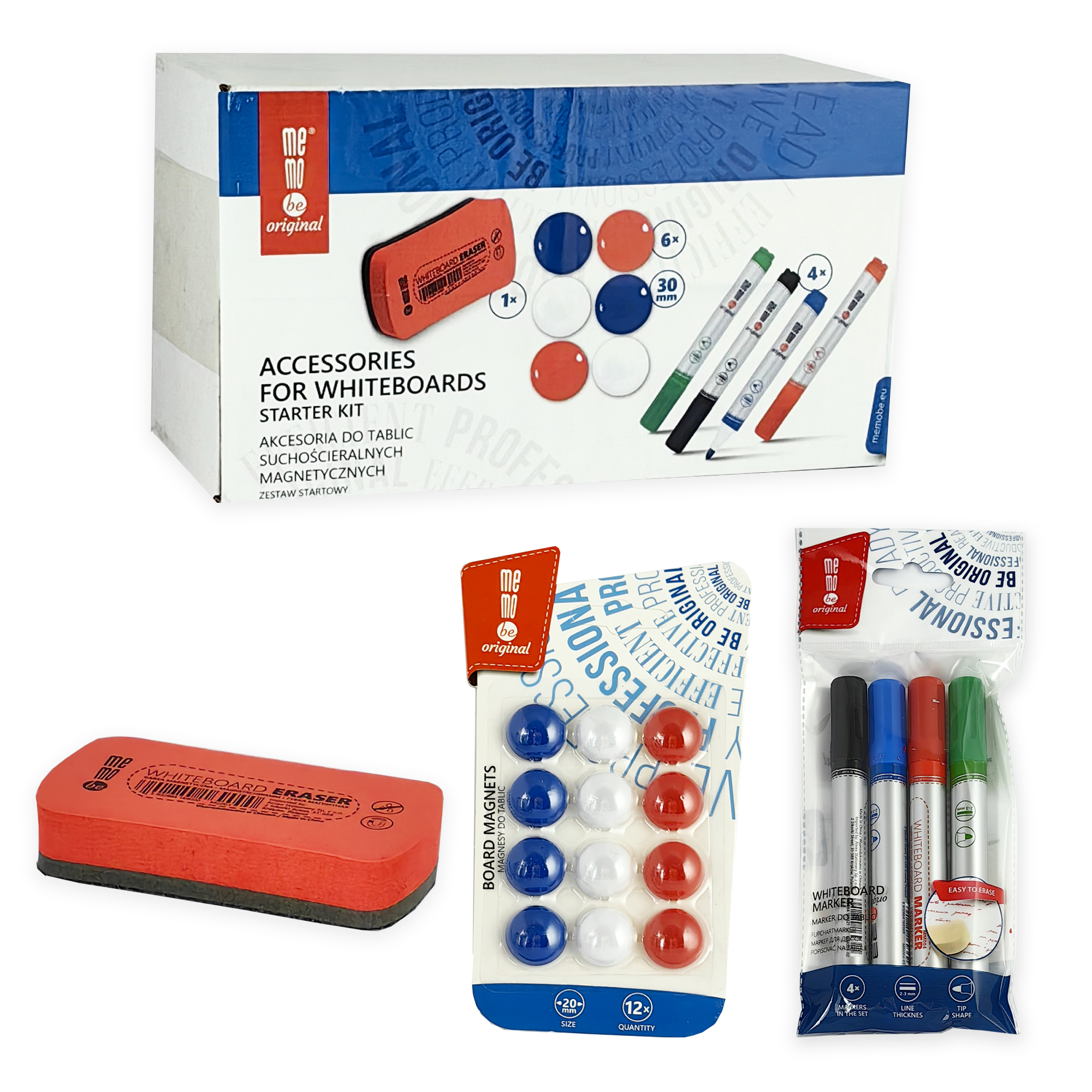 Stredne veľká 4 dielna sada doplnkov pre biele magnetické tabule. Balenie obsahuje 250ml čistiaci roztok s rozprašovačom (ľahko odstraňuje nečistoty a zbytky popisu na bielych tabuliach, leští povrch), 4ks popisovačov, magnetickú stierku, 12ks magnetov.