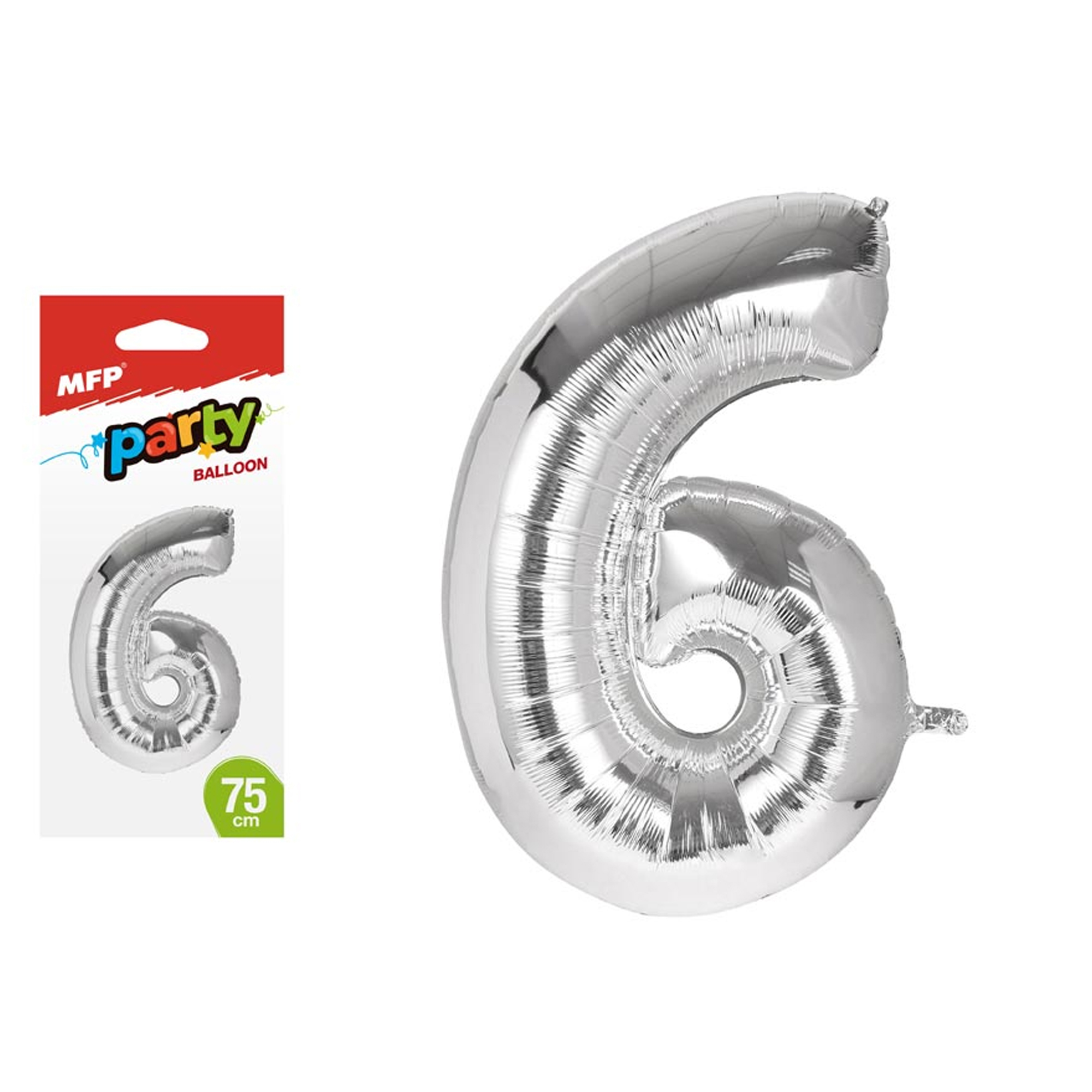 Narodeninová oslava sa môže začať! Balóniková číselná dekorácia, ktorá poteší každého oslávenca. Skvelý tip pre každú narodeninovú párty. Fóliové 75 cm strieborné číslo 6 je vhodným doplnkom novoročnej aj narodeninovej výzdoby. Balónik je vyrobený zo striebornej fólie. Na hornej strane balónika sú očká na priviazanie.