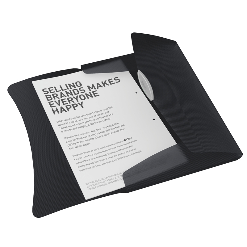 Skladací stojan na časopisy, katalógy, prospekty, dokumenty a iné materiály formátu A4. Stojan z dizajnovej rady VIVIDA v sviežich farbách. Vyrobený z pevnej lepenky, obojstranne potiahnutá PVC fóliou. Klasická šírka chrbta 100 mm dostupná v ôsmych farbách. Súčasťou chrbtový obal a popisovateľný papierový štítok. Rozmery: 100 x 320 x 240 mm Šírka chrbta: 100 mm, A4 Farba čierna
