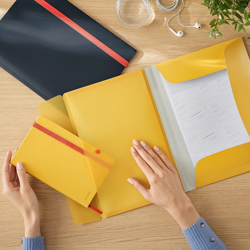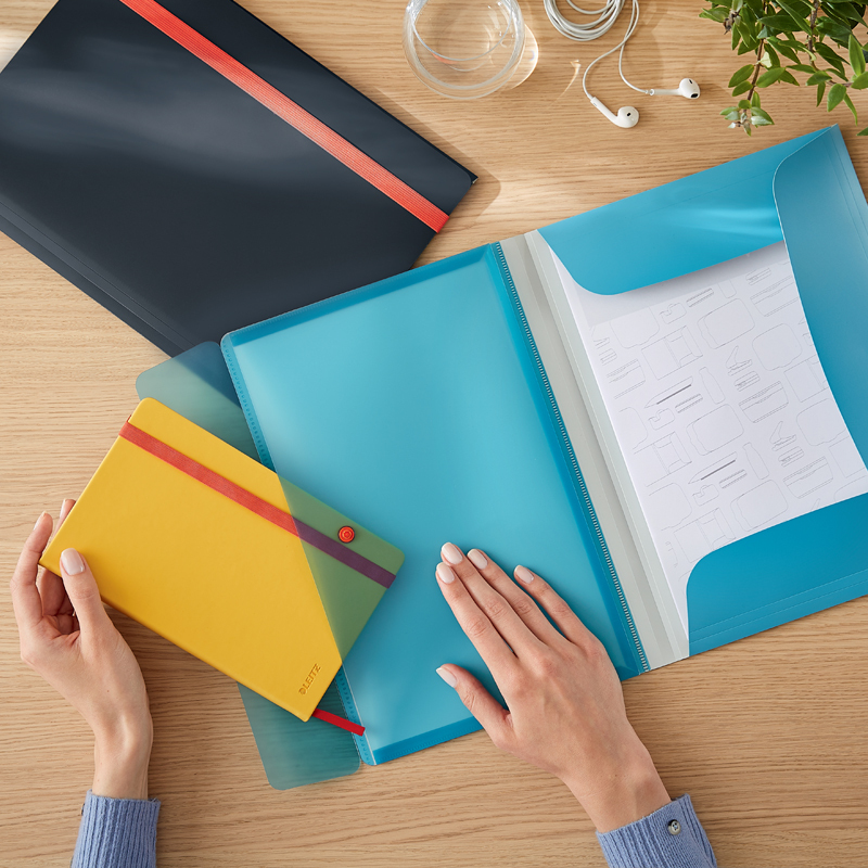 Obal s chlopňou a s vnútorným vreckom Leitz Cosy s hebkým povrchom je ideálne na organizáciu a usporiadanie dokumentov. Vnútorné vrecko môžete využiť na ceruzky, káble, telefón – na všetko, čo na schôdzkach potrebujete. Vďaka tomuto štýlovému kartónovému obalu a hrubej elastickej gumičke zostanú vaše dokumenty usporiadané a zároveň ľahko prístupné. Tieto prémiové obaly sú perfektným doplnkom či už domov alebo do kancelárie, nemusíte sa báť, že by vám z nich niečo vypadlo, a môžete sa pokojne venovať svojej práci. Kolekcia Leitz Cosy kombinuje komfort domáceho pohodlia s prvotriednou kvalitou a vytvára tak pozitívne a produktívne pracovné prostredie.