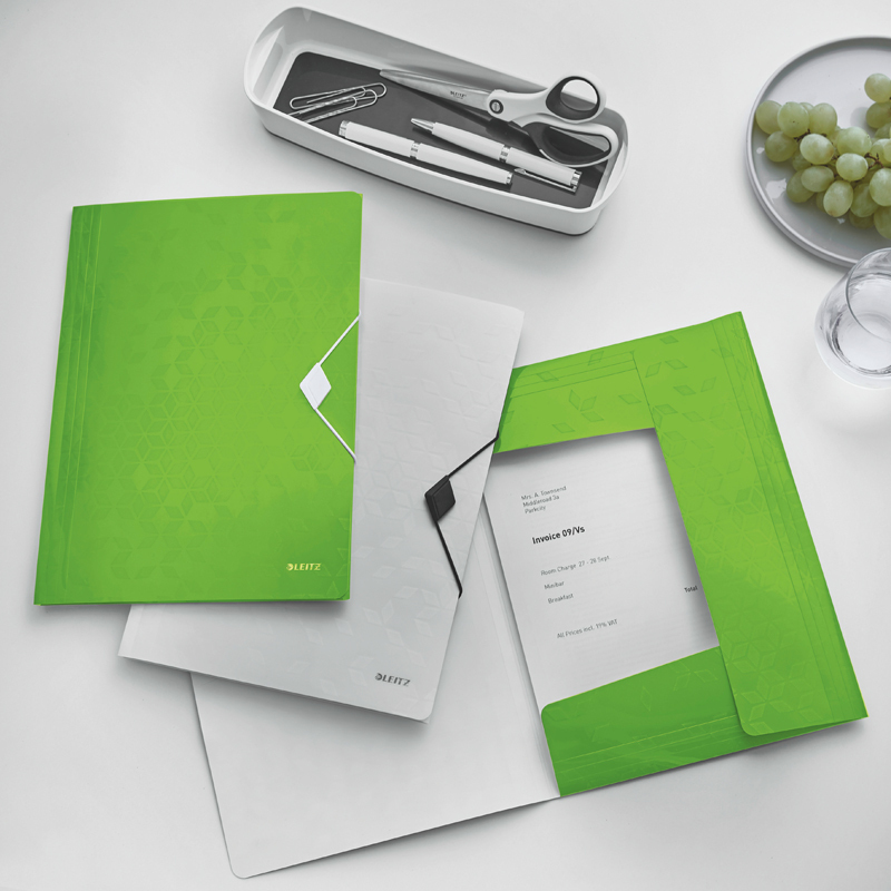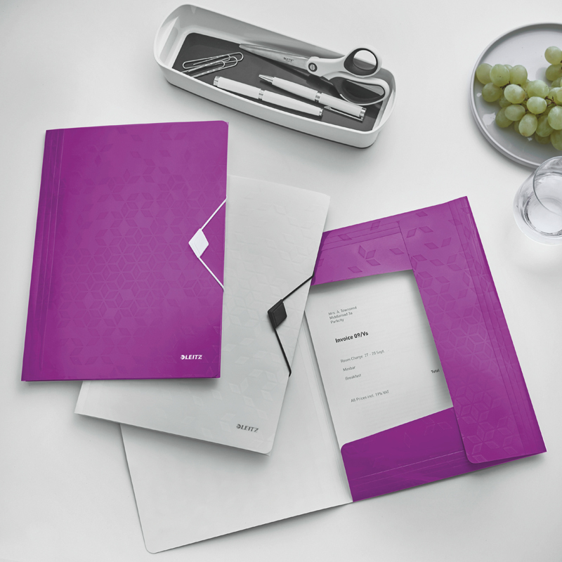 Obal na dokumenty s 3 chlopňami. Kapacitu až do 250 listov papiera A4 pevne fixujú elastické gumičky. Žiarivé farby WOW, ktoré zaujmú na prvý pohľad a sú určené pre výnimočné pracovné prostredie. Vďaka laminácii je povrch obalov na dokumenty lesklejší a pevnejší.