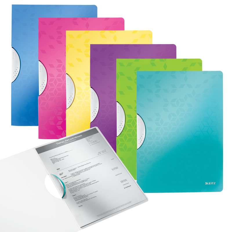 Plastové obaly na prenášanie, organizovanie a ukladanie dokumentov v dizajne Leitz WOW. Má jednoduché uzatváranie pomocou plastových cvočiek. Kapacita obalov až 120 hárkov papiera A4. Sú vyrobené extrémne odolného a pevného materiálu. Balenie obsahuje 6ks obalov vo farbe ľadová modrá, metalická modrá, ružová, žltá, zelená a purpurová.
