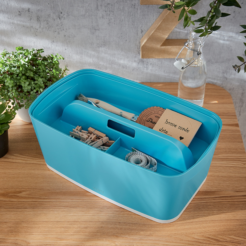 Dizajnový organizér je pevný na ukladanie a zároveň ideálny na prenášanie všetkých dôležitých predmetov, ako sú písacie potreby, drobné domáce náradie alebo napríklad make up. MyBox má certifikáciu Food safe, je vhodný na prenos teplých aj studených jedál, na uloženie potravín vo firemnej kuchynke či recepcii, napríklad čaju, kávy, mlieka a cukru, doma na ovocie a pod. Organizér je súčasťou modulárneho úložného systému Leitz MyBox, je kompatibilný s malým organizačným boxom, ale môže byť používaný aj samostatne. Organizér prvotriednej kvality je perfektným doplnkom vášho domova alebo kancelárie, uľahčí a spríjemní vám prácu. Rozmery 307 x 56 x 181 (mm) Kolekcia Leitz Cosy kombinuje komfort domáceho pohodlia s prvotriednou kvalitou a vytvára tak pozitívne a produktívne pracovné prostredie.