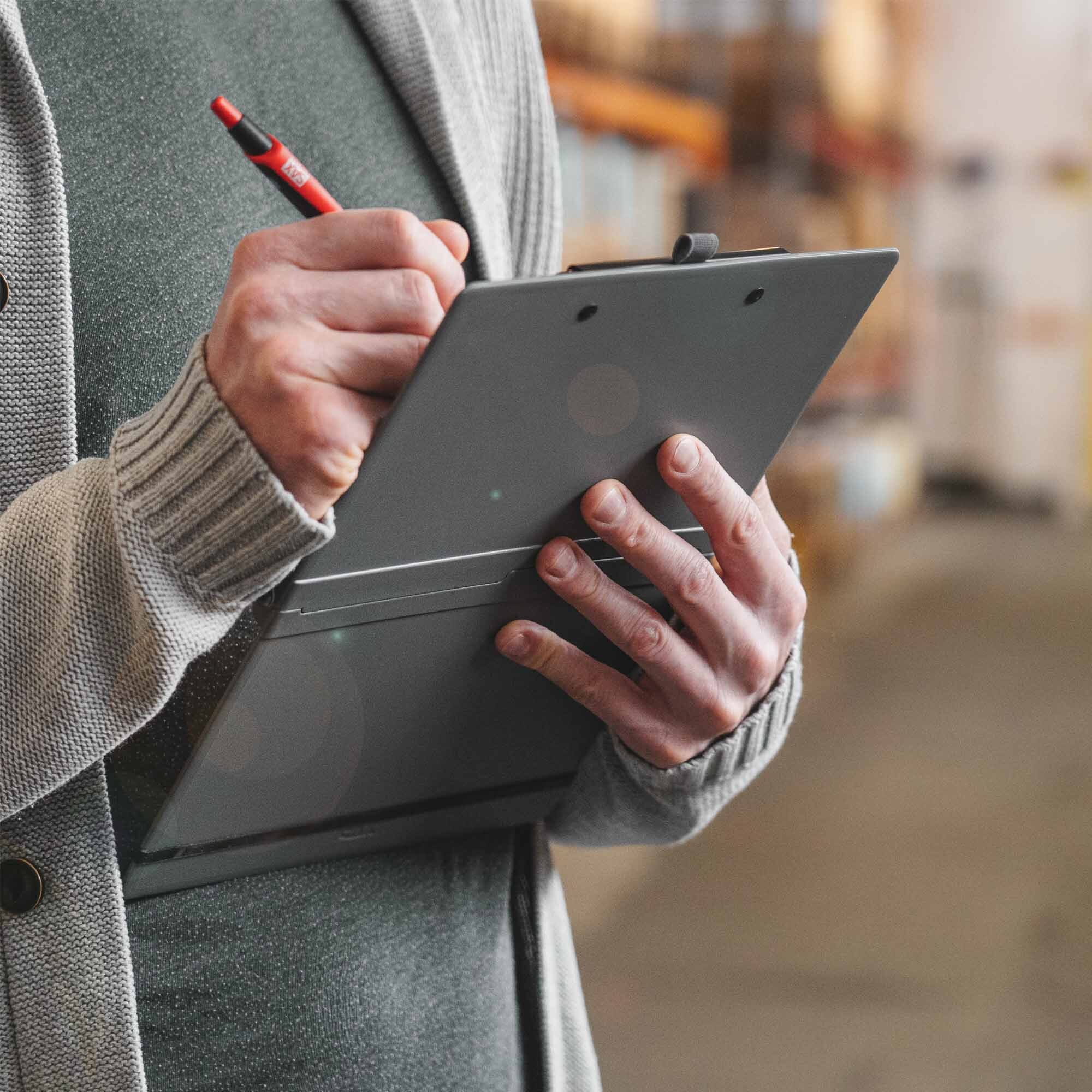 Egyedi íróalátét rugalmas pánttal, amely praktikus segédeszköz a kényelmes jegyzeteléshez munkaasztalon kívül is. Ideális jegyzeteléshez füzetekbe vagy űrlapokba terepen, vagy állva írás közben. Stabil támaszt nyújt és egyszerű kezelhetőséget biztosít, ahol csak szüksége van rá.