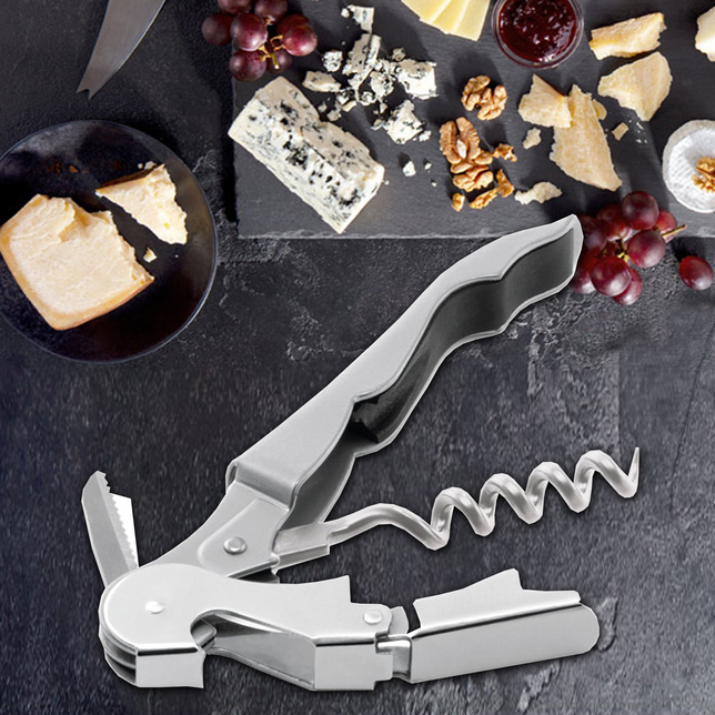 Viacúčelový vývrtka na víno s otváračom na flaše. Vyrobené z nerez ocele. Rozmery: 11,8 x 2 x 1,8 cm