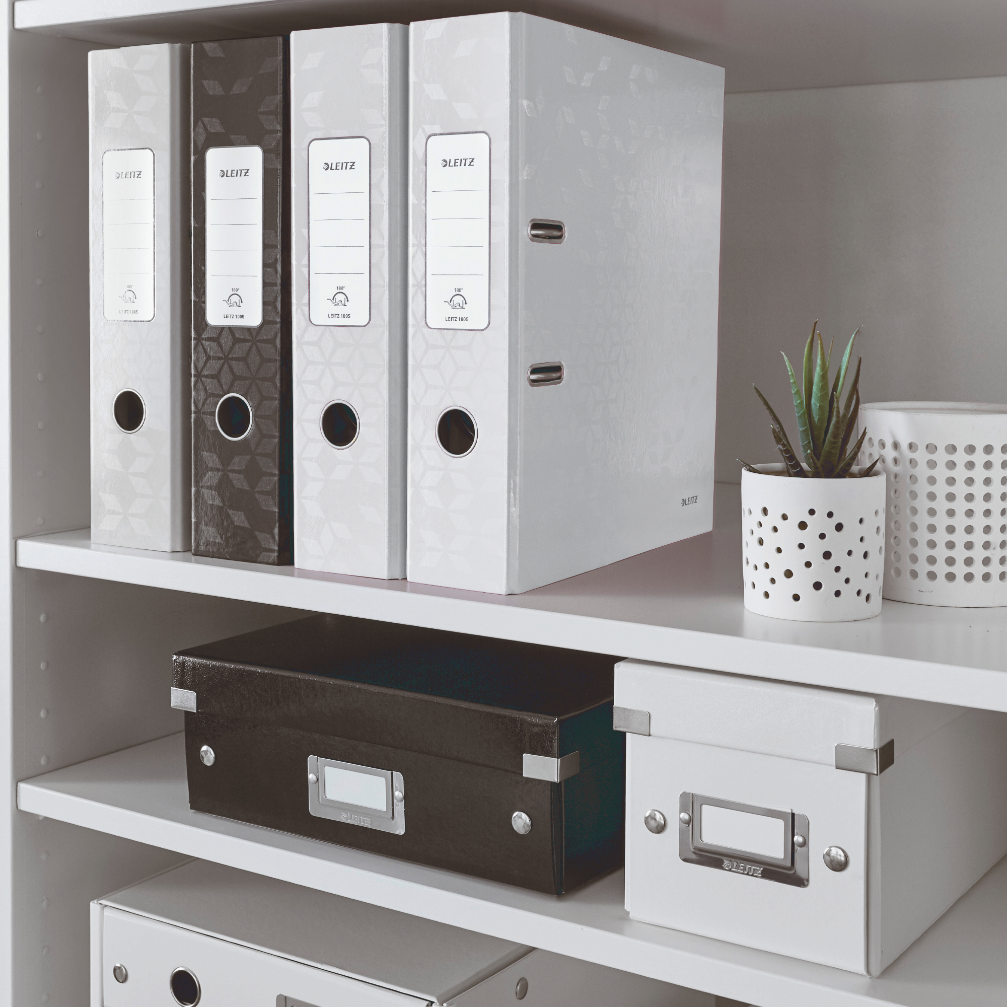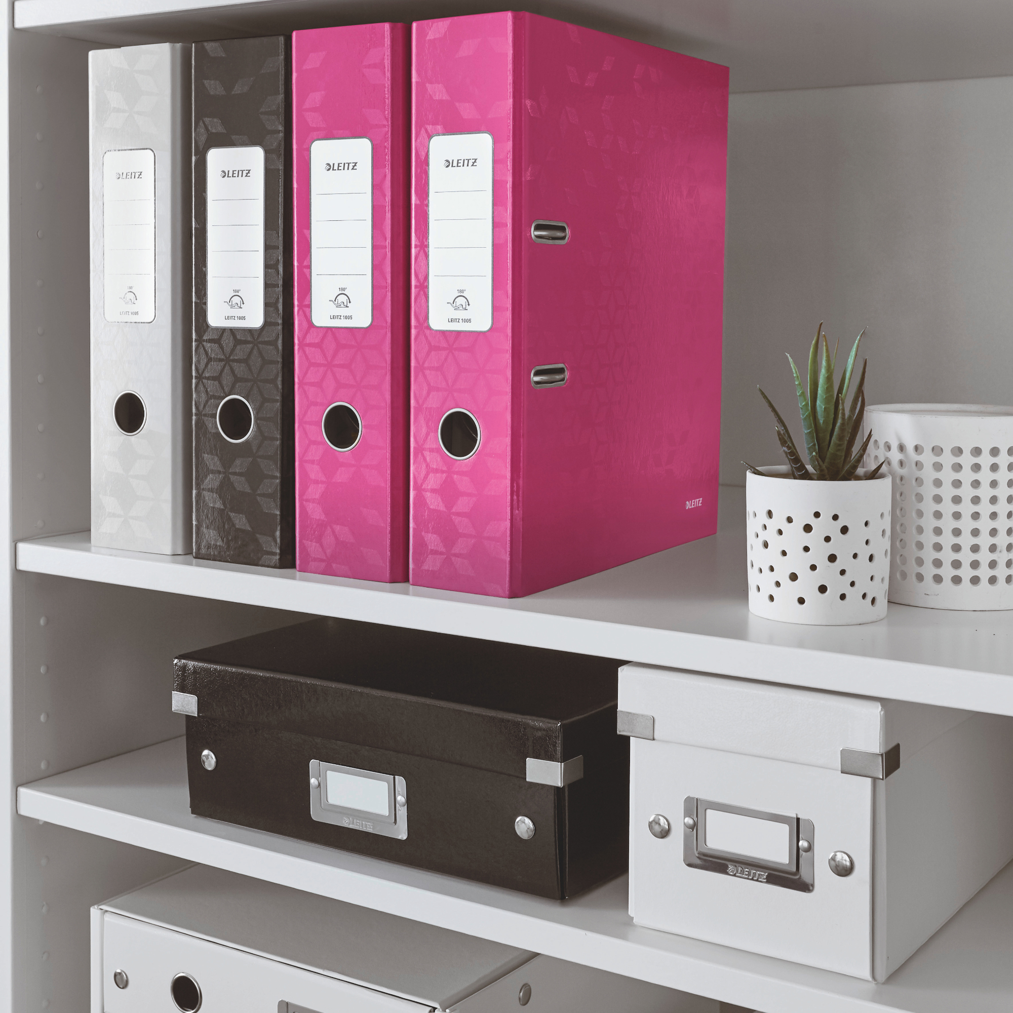 Univerzálna čierna štýlová škatuľa na prehľadné ukladanie dokumentov A4, alebo napr. na rozrobené štrikovanie.. Lesklé PP vyhotovenie vytvára prvotriedny vzhľad škatule a umožňuje dlhodobé používanie a jednoduché utieranie prachu. Má kvalitné kovové rámčeky na popis obsahu s kontrastnými bielymi štítkami. Moderný dizajn, ktorý sa vyníma v každej kancelárii. Dodajte svojmu pracovnému miestu alebo domácnosti farbu a skombinujte škatuľu s ostatnými kancelárskymi výrobkami z radu Leitz WOW. Vyrobené z hrubého kartónu s laminovaným povrchom a kovovými rohmi pre spoľahlivú ochranu. Má pevné kovové držadlá na pohodlnú manipuláciu a prenášanie. Patentovaná konštrukcia zaručuje stohovateľnosť a vyššiu ochranu proti náhodnému rozloženiu škatule pri prenášaní ťažkých vecí. Premyslená skladacia konštrukcia na rýchle a jednoduché zloženie bez nutnosti použitia skrutiek. Možnosť opätovného rozloženia a uloženie do veka keď škatuľu práve nepotrebujete. Váha 0,9 kg. Rozmery 281 x 200 x 370 (mm).
