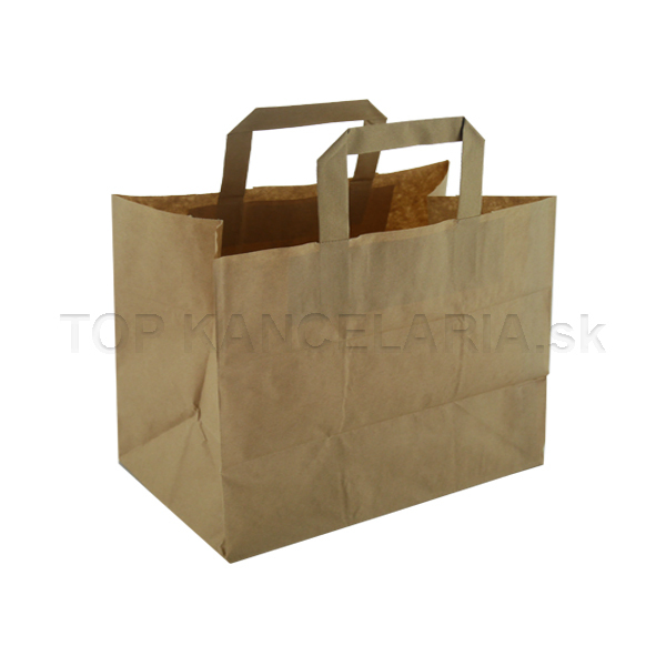 Papierová taška s plochou rúčkou a s vysokou pevnosťou. Je vyrobená z hnedého kraftového papiera pre bezpečnú odnos, prepravu jedál. Rozmer tašky 28x17x27cm. Kartónové balenie 300ks.