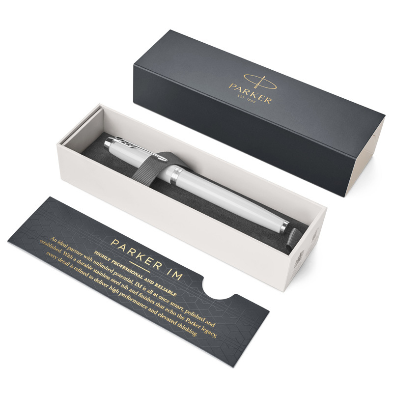 PARKER IM White roller CT so strieborným klipom Racionalita a nadčasová kvalita technologického spracovania Parker IM predurčuje tento modelový rad pre život v pohybe. Nadbytočné detaily sú vynechané, prednosť je daná konfortu a účelnosti. Je to jeden z príkladov múdreho využitia silných stránok Parkeru – dokonalého spojenia tvaru a funkčnosti. Roller je dodávaný s čiernou náplňou QUINK pre rollery