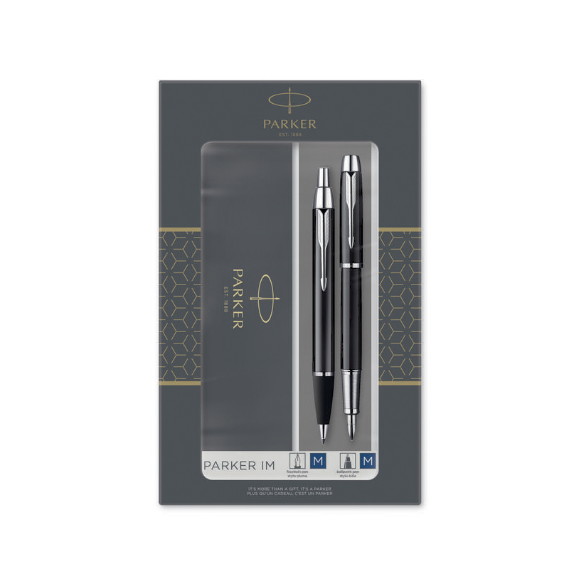 Súprava plniaceho a guľôčkového pera Parker IM Black s lesklou lakovanou povrchovou úpravou v kombinácii s doplnkami pokovovanými chrómom. Telo pera je vyrobené s mosadze. Hrot atramentového pera je z ušľachtilej nerez ocele, zdobená jemnou rytinou. Balenie v darčekový obal. Parker IM je ideálny partner s neobmedzenými možnosťami. Je elegantný aj vysoko profesionálny a spoľahlivý. Ponúka odolný hrot z ušľachtilej nerez ocele, širokú paletu prevedení inšpirovaných tradíciou značky Parker, užívateľské pohodlie aj maximálnu výkonnosť.