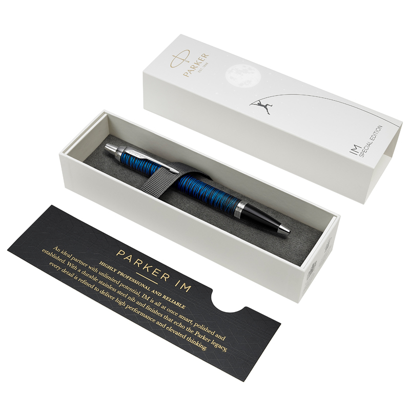 Parker IM Blue Origin guľôčkové pero CT so strieborným klipom Limitovaná edícia, perá zdobené matným čiernym lakom s modrými ozdobnými prvkami vytvorené laserovou technológiou. Má stláčací mechanizmus. Pero je dodávané s modrou náplňou.