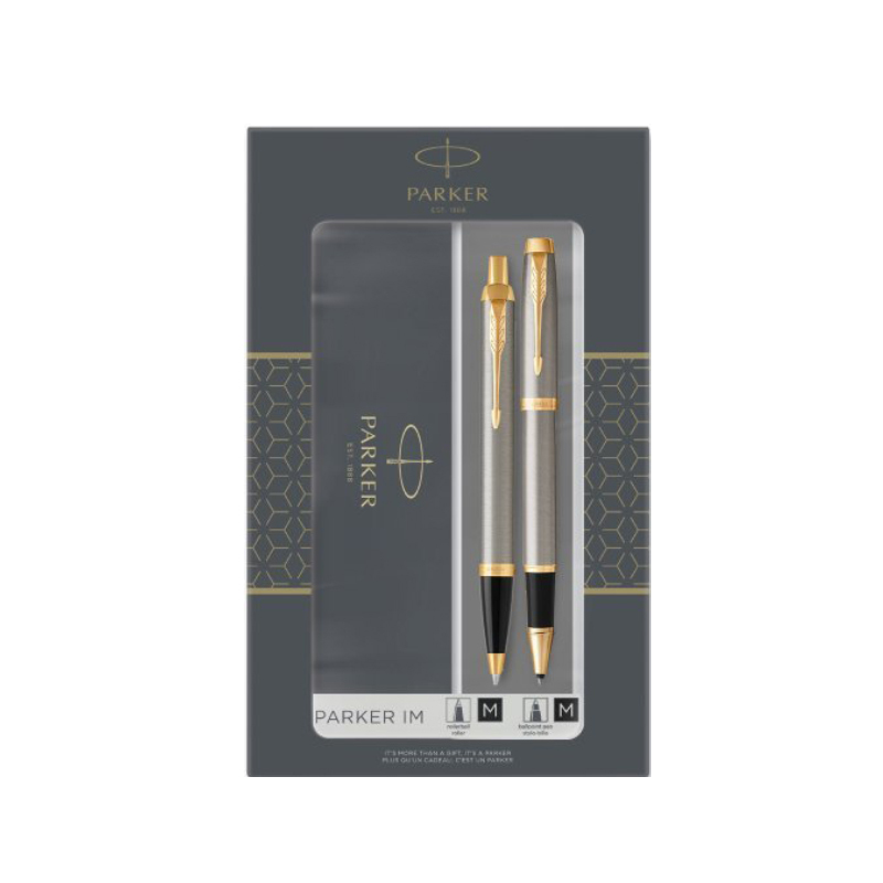 Súprava roller a guľôčkové pero Parker IM Brushed Metal so zlatým klipom v darčekovom obale. Brúsené mosadzné telo a vrchnák s lakovanou povrchovou úpravou v kombinácii s doplnkami pokovovanými zlatom s leštenou úpravou. Telo pera je vyrobené s mosadze. Farba náplne rollera čierna, pera modrá. Balenie v darčekový obal. Parker IM je ideálny partner s neobmedzenými možnosťami. Je elegantný aj vysoko profesionálny a spoľahlivý. Ponúka odolný hrot z ušľachtilej nerez ocele, širokú paletu prevedení inšpirovaných tradíciou značky Parker, užívateľské pohodlie aj maximálnu výkonnosť.