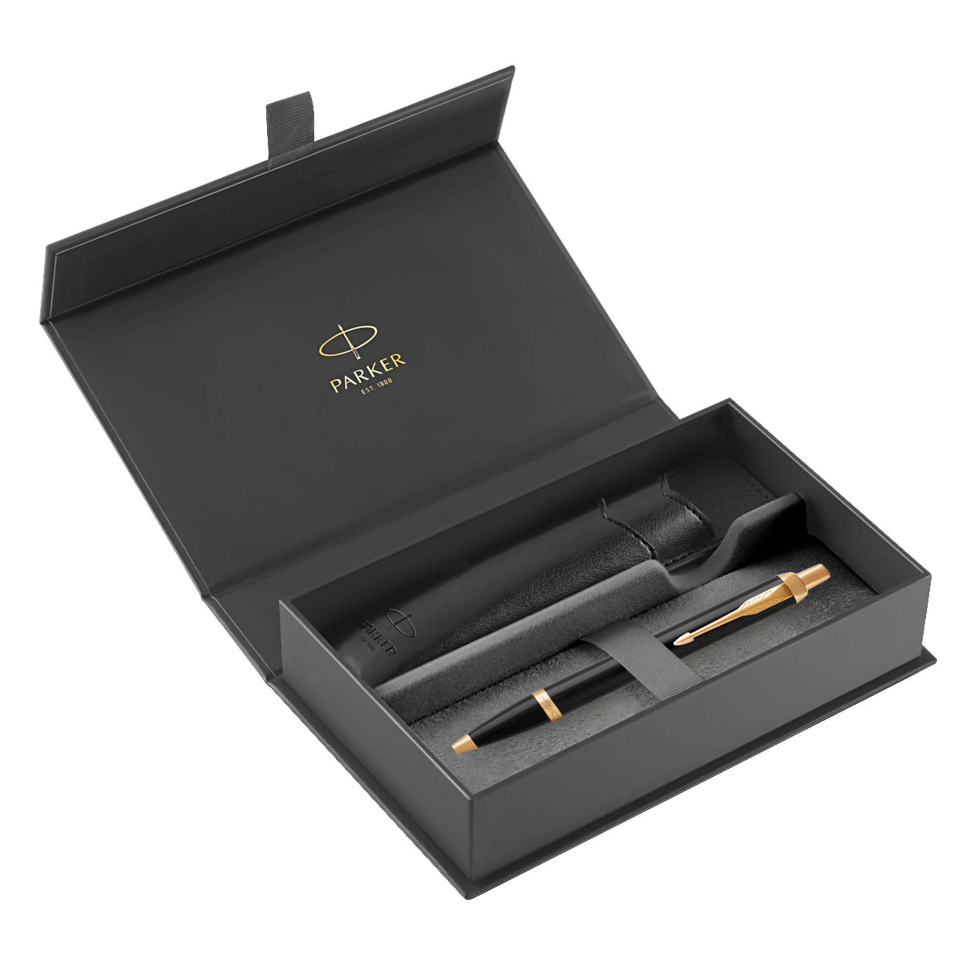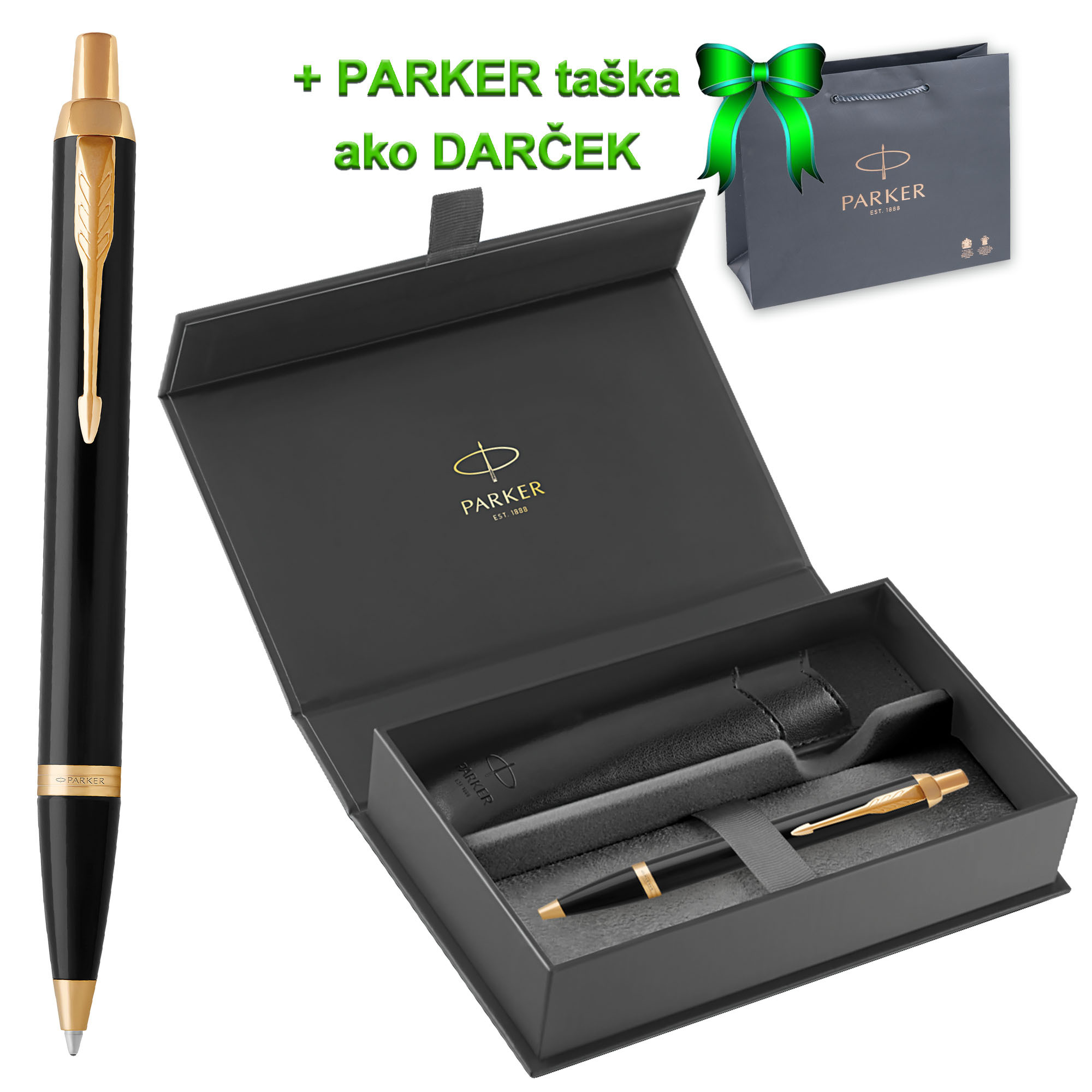 Parker guľôčkové pero IM Black GT so zlatým klipom v darčekovej kazete s puzdrom. Mosadzné telo pera je nalakované lesklou čiernou povrchovou úpravou. V kombinácii s doplnkami pokovovanými zlatom s leštenou úpravou. Racionalita a nadčasová kvalita technologického spracovania Parker IM predurčuje tento modelový rad pre život v pohybe. Nadbytočné detaily sú vynechané, prednosť je daná komfortu a účelnosti. Je to jeden z príkladov múdreho využitia silných stránok Parkeru – dokonalého spojenia tvaru a funkčnosti. Má stláčací mechanizmus. Pero je dodávané s modrou náplňou.