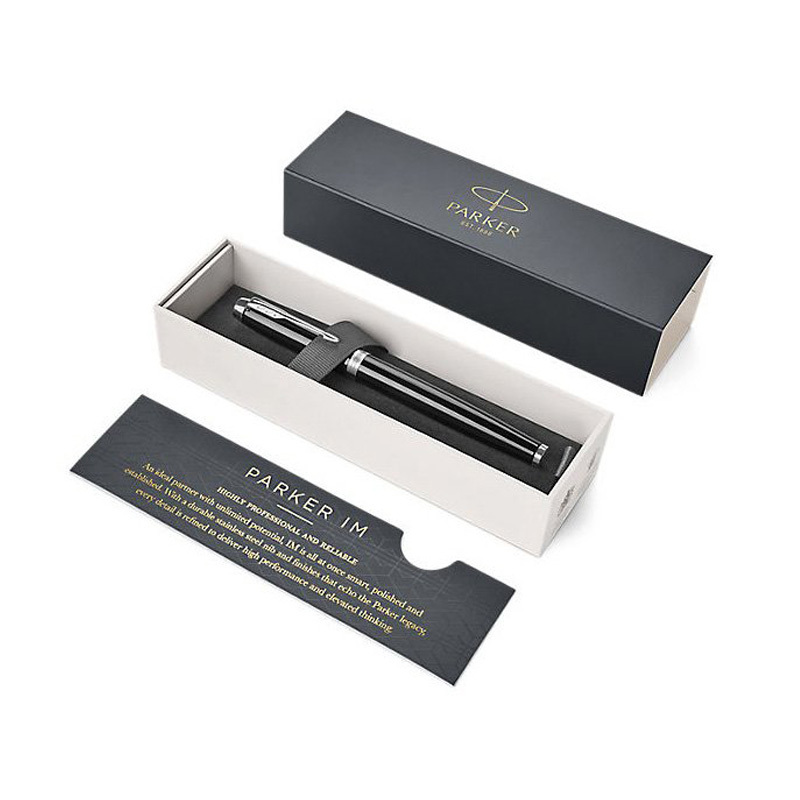 PARKER IM Black CT roller so strieborným klipom Racionalita a nadčasová kvalita technologického spracovania Parker I.M. predurčuje tento modelový rad pre život v pohybe. Nadbytočné detaily sú vynechané, prednosť je daná konfortu a účelnosti. Je to jeden z príkladov múdreho využitia silných stránok Parkeru – dokonalého spojenia tvaru a funkčnosti. Roller je dodávaný s čiernou náplňou QUINK pre rollery