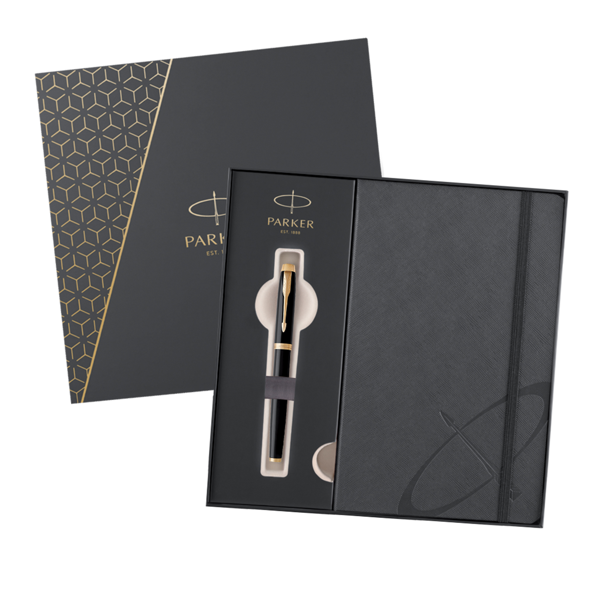 Roller Parker IM Black GT so zlatým klipom v darčekovej kazete so zápisníkom. Mosadzné telo a vrchnák pera je nalakovaný lesklou čiernou povrchovou úpravou. V kombinácii s doplnkami pokovovanými zlatom s leštenou úpravou. Súprava obsahuje čierne puzdro a roller Parker IM Black. Racionalita a nadčasová kvalita technologického spracovania Parker IM predurčuje tento modelový rad pre život v pohybe. Nadbytočné detaily sú vynechané, prednosť je daná konfortu a účelnosti. Je to jeden z príkladov múdreho využitia silných stránok Parkeru – dokonalého spojenia tvaru a funkčnosti. Roller je dodávaný s čiernou náplňou QUINK