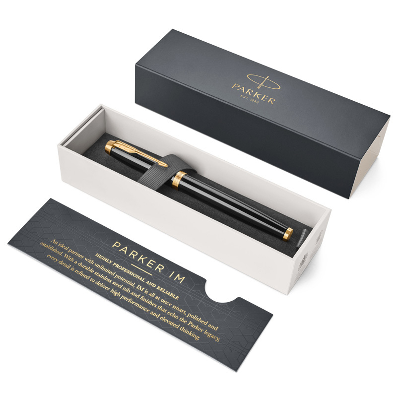 PARKER IM Black CT gulôčkové pero so zlatým klipom Racionalita a nadčasová kvalita technologického spracovania Parker IM predurčuje tento modelový rad pre život v pohybe. Nadbytočné detaily sú vynechané, prednosť je daná konfortu a účelnosti. Je to jeden z príkladov múdreho využitia silných stránok Parkeru – dokonalého spojenia tvaru a funkčnosti. Má stláčací mechanizmus. Pero je dodávané s modrou náplňou.