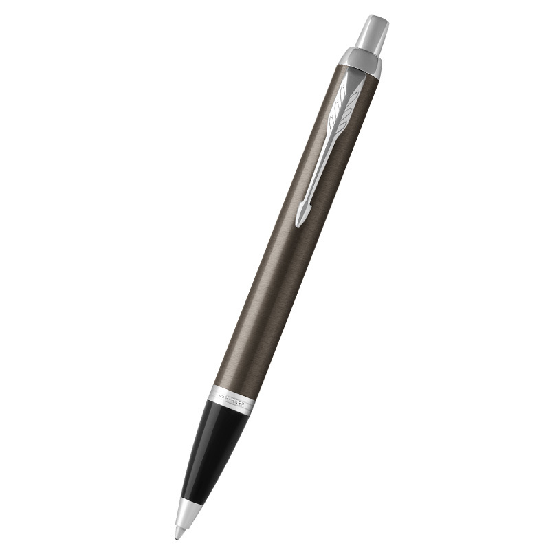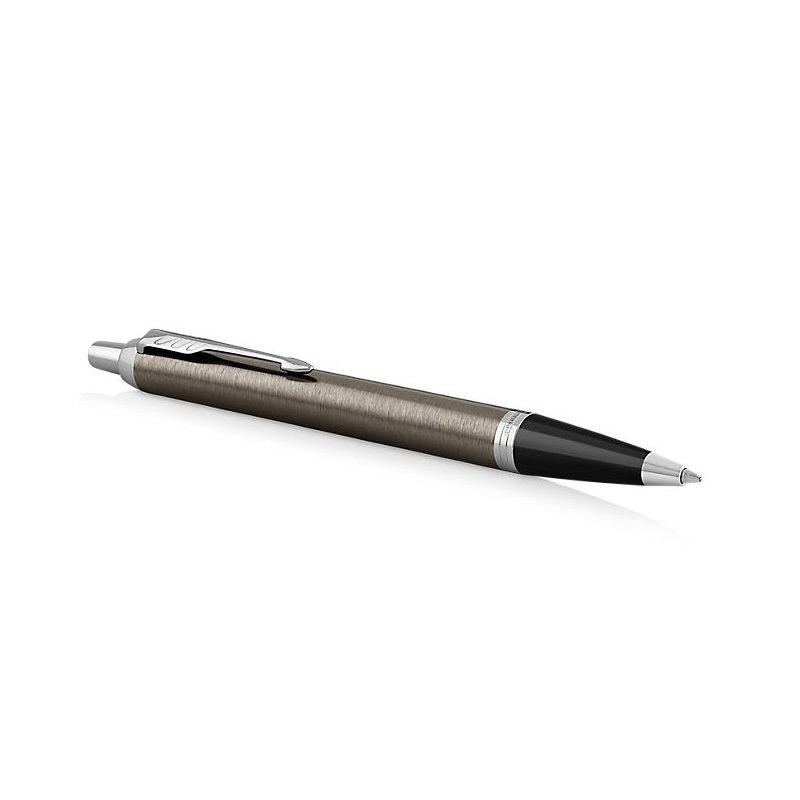 Parker IM Dark Espresso gulôčkové pero so strieborným klipom CT Guľôčkového pero Parker IM Dark Espresso CT. Brúsené mosadzné telo a vrchnák s lakovanou povrchovou úpravou. Hrot z ušľachtilej nerez ocele. V kombinácii s doplnkami pokovovanými chrómom, s leštenou úpravou. Má stláčací mechanizmus. Pero je dodávané s modrou náplňou.