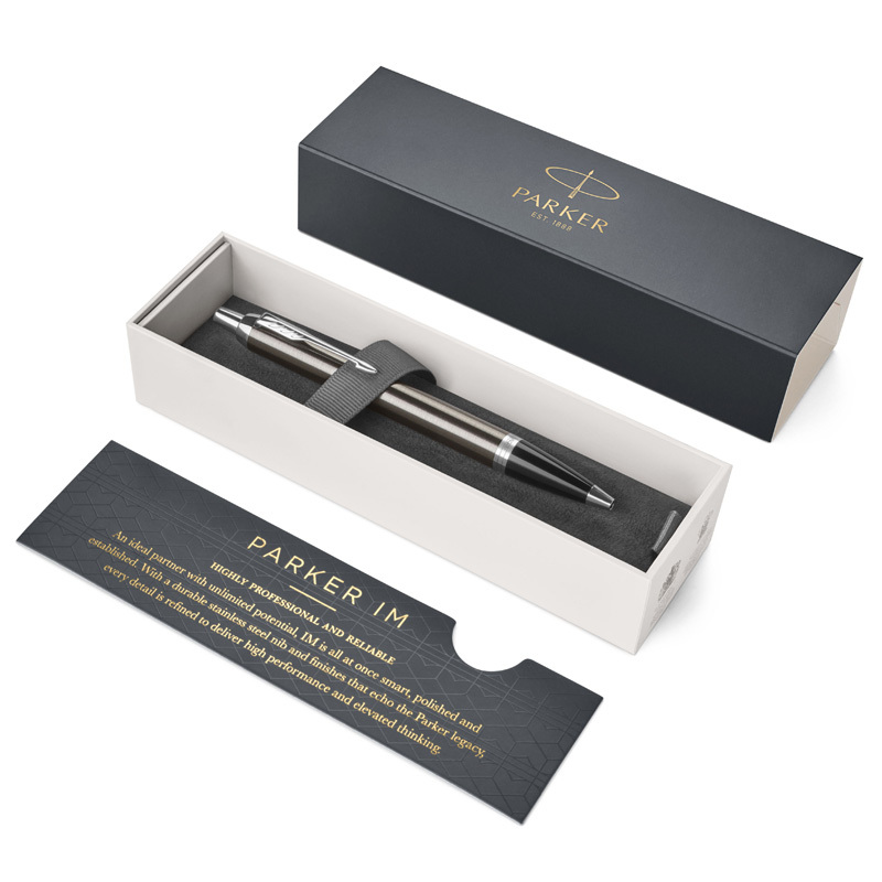 Parker IM Dark Espresso plniace pero so strieborným klipom CT Racionalita a nadčasová kvalita technologického spracovania Parker IM predurčuje tento modelový rad pre život v pohybe. Nadbytočné detaily sú vynechané, prednosť je daná konfortu a účelnosti. Je to jeden z príkladov múdreho využitia silných stránok Parkeru – dokonalého spojenia tvaru a funkčnosti. Hrot vyrobený z nerez ocele, zdobený jemnou rytinou. Má dvojkanálový systém zásobovania hrotu s atramentom. Perá Parker su prispôsobené výhradne k používaniu atramentových bombičiek QUINK alebo konvertoru zn. Parker. Konvertor nie je súčasťou balenia. Pero je dodávané s modrou bombičkou.