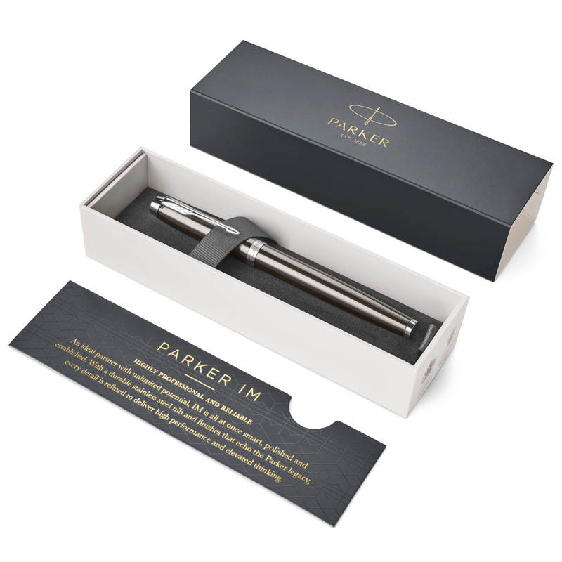 Parker IM Dark Espresso roller so strieborným klipom CT Racionalita a nadčasová kvalita technologického spracovania Parker IM predurčuje tento modelový rad pre život v pohybe. Nadbytočné detaily sú vynechané, prednosť je daná konfortu a účelnosti. Je to jeden z príkladov múdreho využitia silných stránok Parkeru – dokonalého spojenia tvaru a funkčnosti. Roller je dodávaný s čiernou náplňou QUINK pre rollery