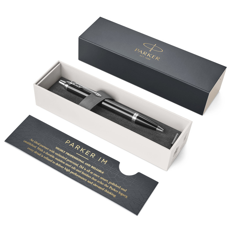 PARKER IM Black CT guľôčkové pero má mosadzné telo s čiernou lesklou lakovanou povrchovou úpravou. Klip a ostatné doplnky má pokovované chrómom s leštenou úpravou. Racionalita a nadčasová kvalita technologického spracovania Parker IM predurčuje tento modelový rad pre život v pohybe. Nadbytočné detaily sú vynechané, prednosť je daná komfortu a účelnosti. Je to jeden z príkladov múdreho využitia silných stránok Parkeru – dokonalého spojenia tvaru a funkčnosti. Má stláčací mechanizmus. Pero je dodávané s modrou náplňou.