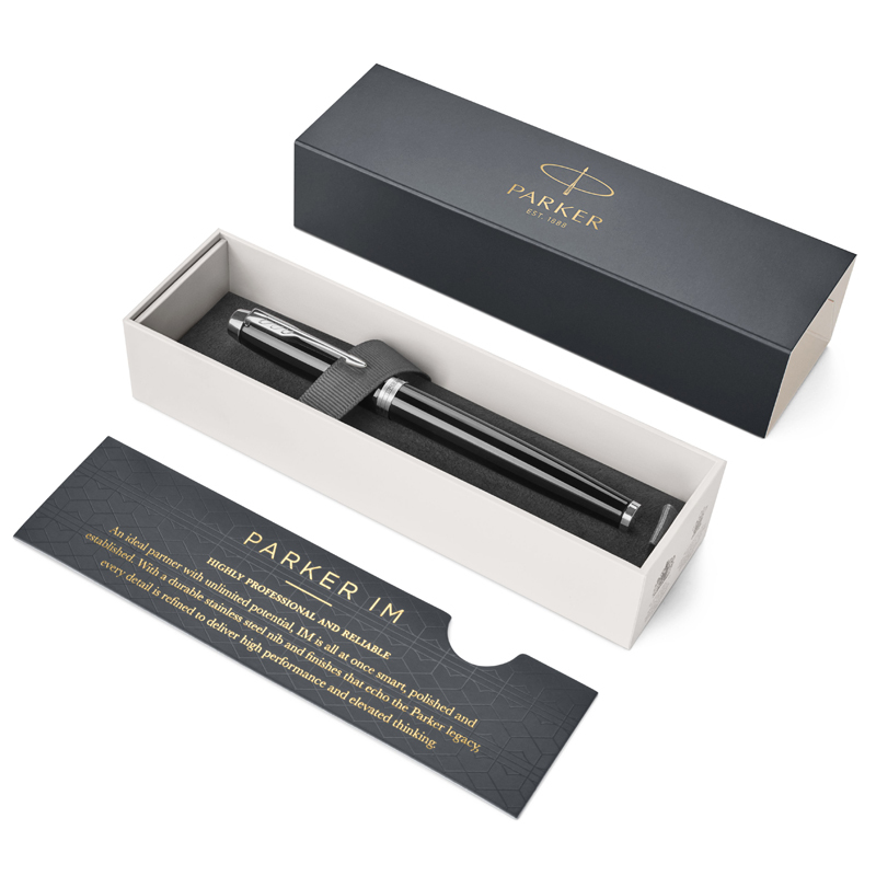 PARKER IM Black CT roller so strieborným klipom Racionalita a nadčasová kvalita technologického spracovania Parker I.M. predurčuje tento modelový rad pre život v pohybe. Nadbytočné detaily sú vynechané, prednosť je daná konfortu a účelnosti. Je to jeden z príkladov múdreho využitia silných stránok Parkeru – dokonalého spojenia tvaru a funkčnosti. Roller je dodávaný s čiernou náplňou QUINK pre rollery