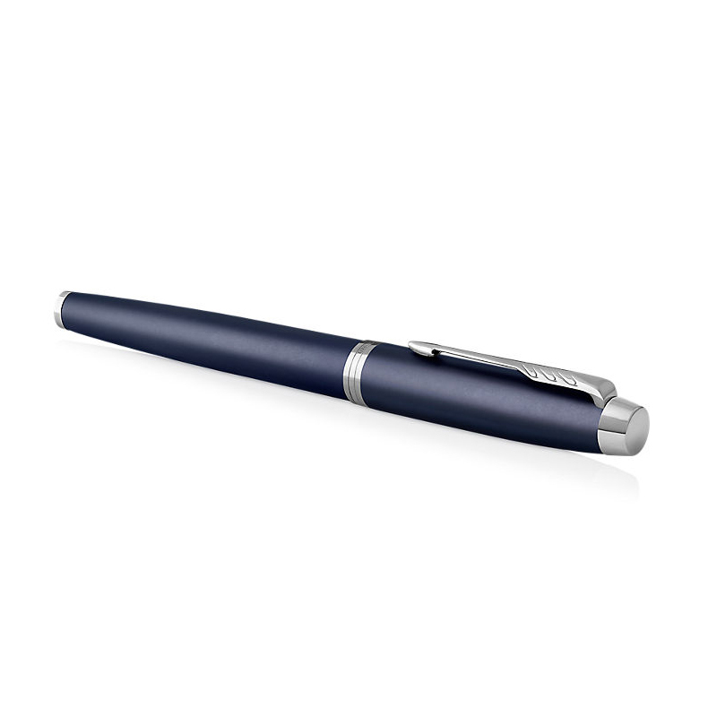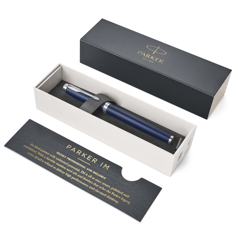 Parker IM Blue roller CT so strieborným klipom Racionalita a nadčasová kvalita technologického spracovania Parker IM predurčuje tento modelový rad pre život v pohybe. Nadbytočné detaily sú vynechané, prednosť je daná konfortu a účelnosti. Je to jeden z príkladov múdreho využitia silných stránok Parkeru – dokonalého spojenia tvaru a funkčnosti. Roller je dodávaný s čiernou náplňou QUINK pre rollery