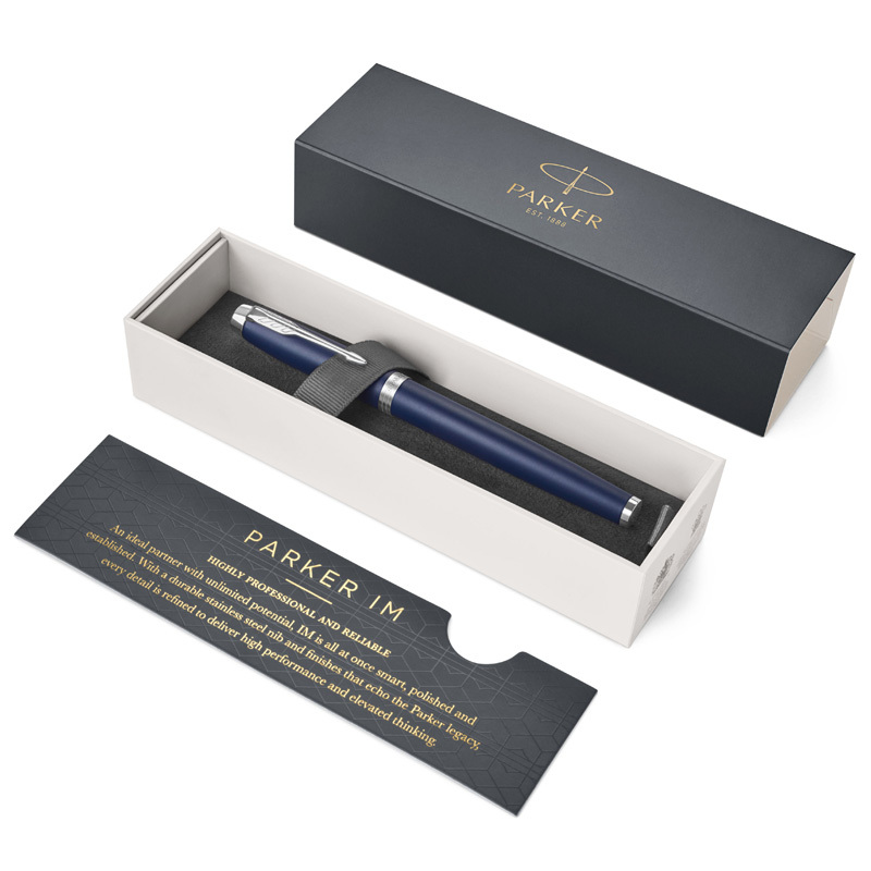 Parker IM Blue roller CT so strieborným klipom Racionalita a nadčasová kvalita technologického spracovania Parker IM predurčuje tento modelový rad pre život v pohybe. Nadbytočné detaily sú vynechané, prednosť je daná konfortu a účelnosti. Je to jeden z príkladov múdreho využitia silných stránok Parkeru – dokonalého spojenia tvaru a funkčnosti. Roller je dodávaný s čiernou náplňou QUINK pre rollery