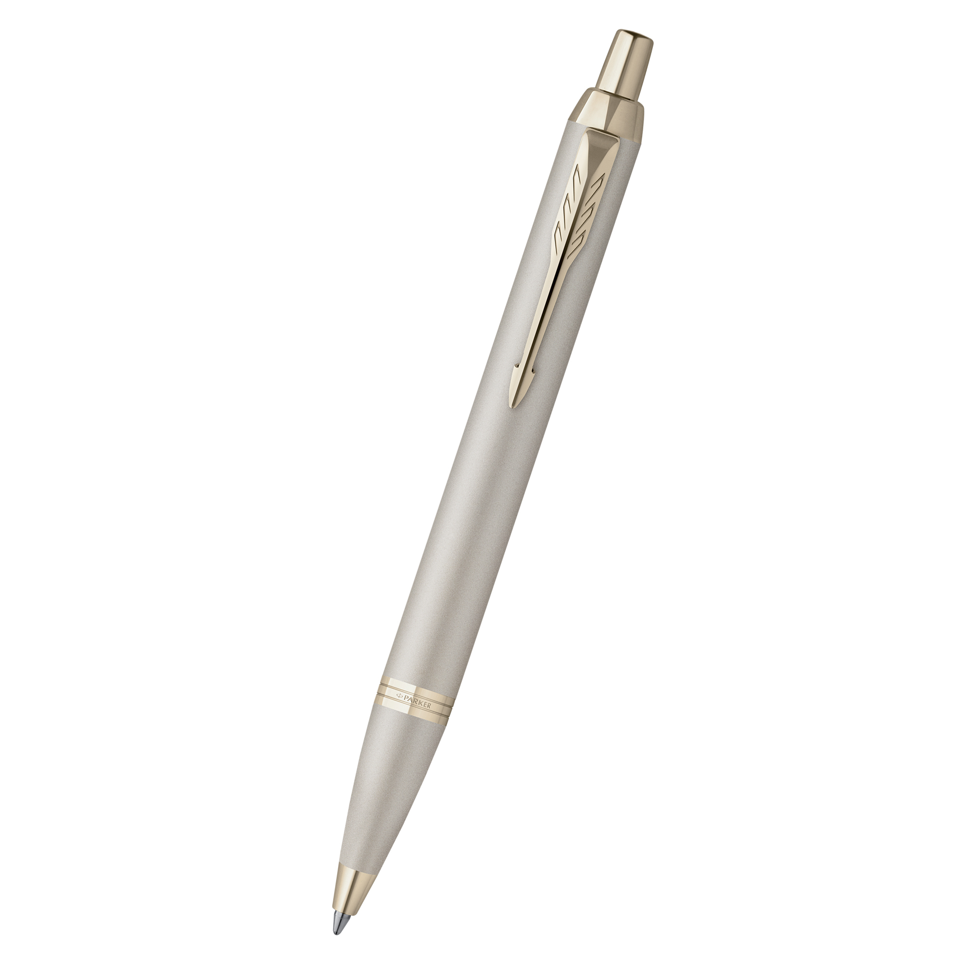 Guľôčkové pero IM Monochrome Champagne v darčekovej kazete. Mosadzné telo pokryté saténovo matným lakom vo farbe champagne. Doplnky potiahnuté odolnou vrstvou champagne pomocou techniky PVD. Pero je dodávané s modrou náplňou. Parker IM Monochrome je príkladom funkčnosti a elegancie, ktorá vynikne v akejkoľvek situácii. Farebne zladené časti pera kopírujú trendy a sú zosobnením vycibreného vkusu. Farebná povrchová úprava je pomocou techniky PVD, vďaka ktorej ostane extrémne odolná. Parker IM Monochrome je jasnou voľbou pre tých, čo hľadajú štýlové a spoľahlivé pero