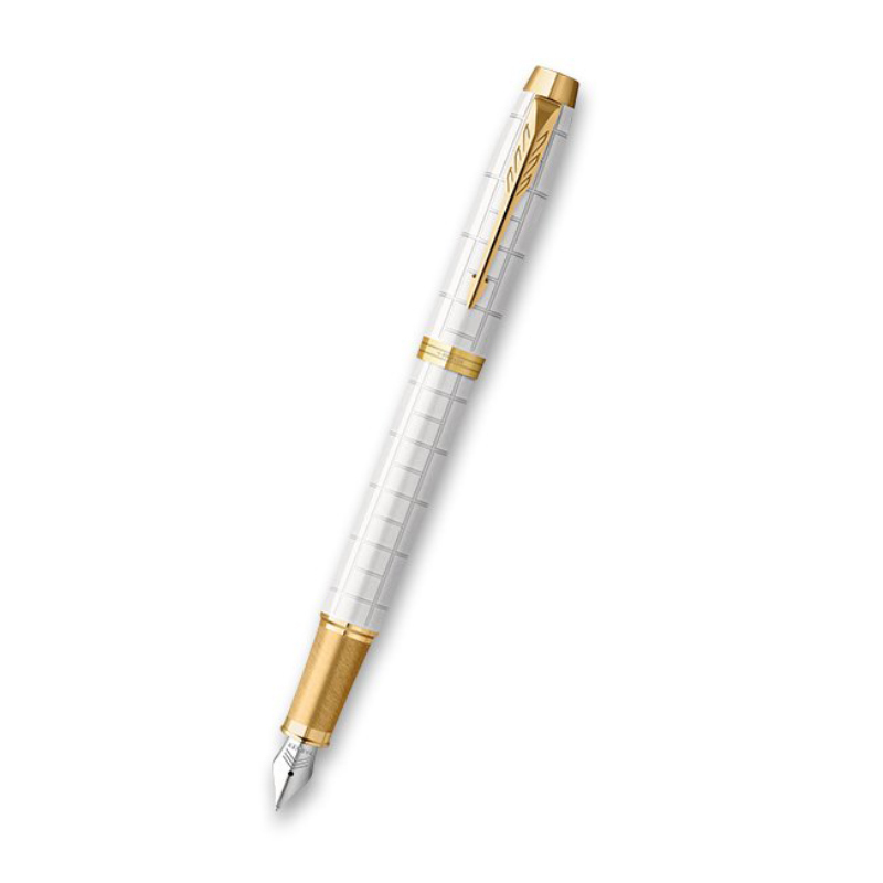 PARKER IM Premium Pearl biele atramentové pero GT so zlatým klipom v darčekovej kazete s puzdrom na pero. Telo a vrchnák vyrobený z mosadze s ozdobnou rastrovanou rytinou v kombinácii s doplnkami pokovovanými zlatom. Hrot z ušlachtelej nerez ocele Racionalita a nadčasová kvalita technologického spracovania Parker I.M Premium predurčuje tento modelový rad pre život v pohybe. Nadbytočné detaily sú vynechané, prednosť je daná konfortu a účelnosti. Je to jeden z príkladov múdreho využitia silných stránok Parkeru – dokonalého spojenia tvaru a funkčnosti. Hrot vyrobený z nerez ocele, zdobený jemnou rytinou. Má dvojkanálový systém zásobovania hrotu s atramentom. Perá Parker su prispôsobené výhradne k používaniu atramentových bombičiek QUINK alebo konvertoru zn. Parker. Konvertor nie je súčasťou balenia. Pero je dodávané s modrou bombičkou.