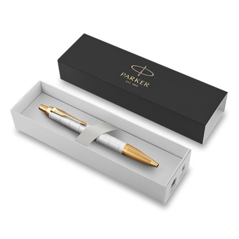 PARKER IM Premium Pearl biele guľôčkové pero GT so zlatým klipom. Telo vyrobený z mosadze s ozdobnou rastrovanou rytinou v kombinácii s doplnkami pokovovanými zlatom. Racionalita a nadčasová kvalita technologického spracovania Parker I.M Premium predurčuje tento modelový rad pre život v pohybe. Nadbytočné detaily sú vynechané, prednosť je daná komfortu a účelnosti. Je to jeden z príkladov múdreho využitia silných stránok Parkeru – dokonalého spojenia tvaru a funkčnosti. Hrot vyrobený z nerez ocele, zdobený jemnou rytinou. Má dvojkanálový systém zásobovania hrotu s atramentom. Perá Parker su prispôsobené výhradne k používaniu atramentových bombičiek QUINK alebo konvertoru zn. Parker. Konvertor nie je súčasťou balenia. Pero je dodávané s modrou bombičkou.