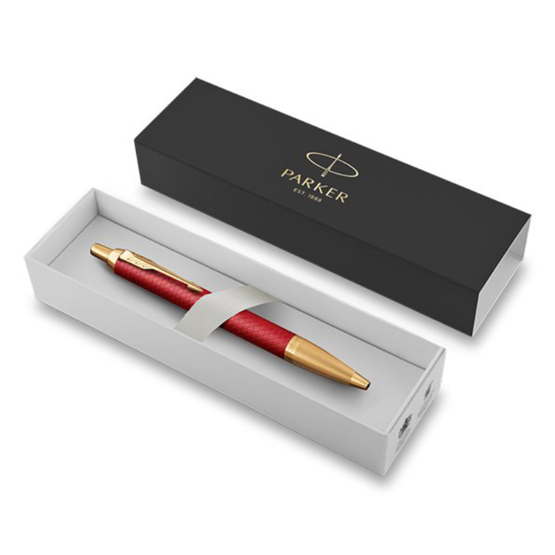 PARKER IM Prémium Red guľóčkové pero GT so zlatým klipom. Telo vyrobené z mosadze s ozdobnou rastrovanou, reliéfnou rytinou v kombinácii s doplnkami pokovovanými zlatom s leštenou úpravou. Racionalita a nadčasová kvalita technologického spracovania Parker IM Premium predurčuje tento modelový rad pre život v pohybe. Nadbytočné detaily sú vynechané, prednosť je daná komfortu a účelnosti. Je to jeden z príkladov múdreho využitia silných stránok Parkeru – dokonalého spojenia tvaru a funkčnosti. Má stláčací mechanizmus. Pero je dodávané s modrou náplňou