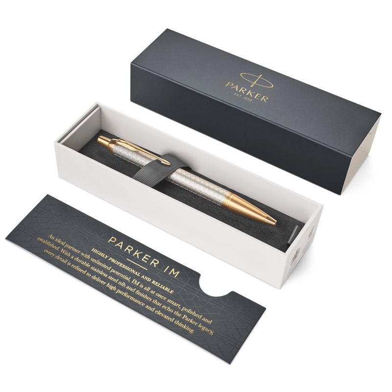 PARKER IM.Premium Warm Grey guľóčkové pero GT so zlatým klipom Racionalita a nadčasová kvalita technologického spracovania Parker IM Premium predurčuje tento modelový rad pre život v pohybe. Nadbytočné detaily sú vynechané, prednosť je daná konfortu a účelnosti. Je to jeden z príkladov múdreho využitia silných stránok Parkeru – dokonalého spojenia tvaru a funkčnosti. Má stláčací mechanizmus. Pero je dodávané s modrou náplňou.