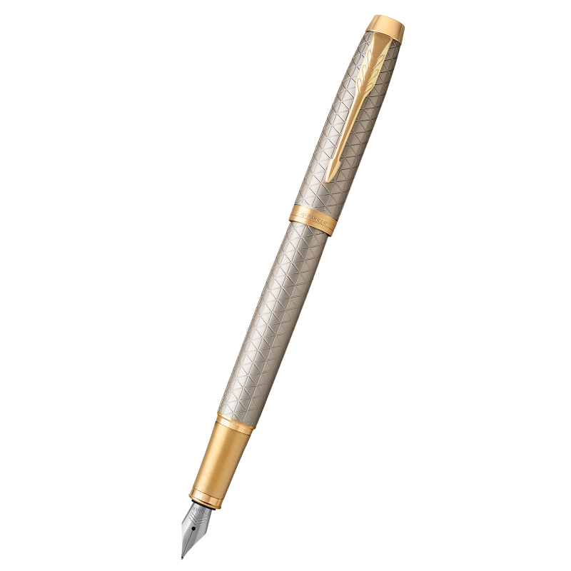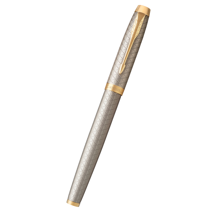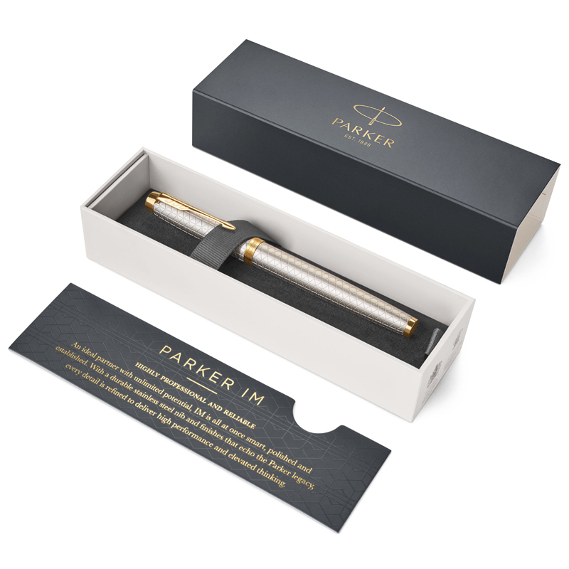 PARKER IM.Premium Warm Grey plniace pero GT so zlatým klipom Racionalita a nadčasová kvalita technologického spracovania Parker IM Premium predurčuje tento modelový rad pre život v pohybe. Nadbytočné detaily sú vynechané, prednosť je daná konfortu a účelnosti. Je to jeden z príkladov múdreho využitia silných stránok Parkeru – dokonalého spojenia tvaru a funkčnosti. Hrot vyrobený z nerez ocele, zdobený jemnou rytinou. Má dvojkanálový systém zásobovania hrotu s atramentom. Perá Parker su prispôsobené výhradne k používaniu atramentových bombičiek QUINK alebo konvertoru zn. Parker. Konvertor nie je súčasťou balenia. Pero je dodávané s modrou bombičkou.