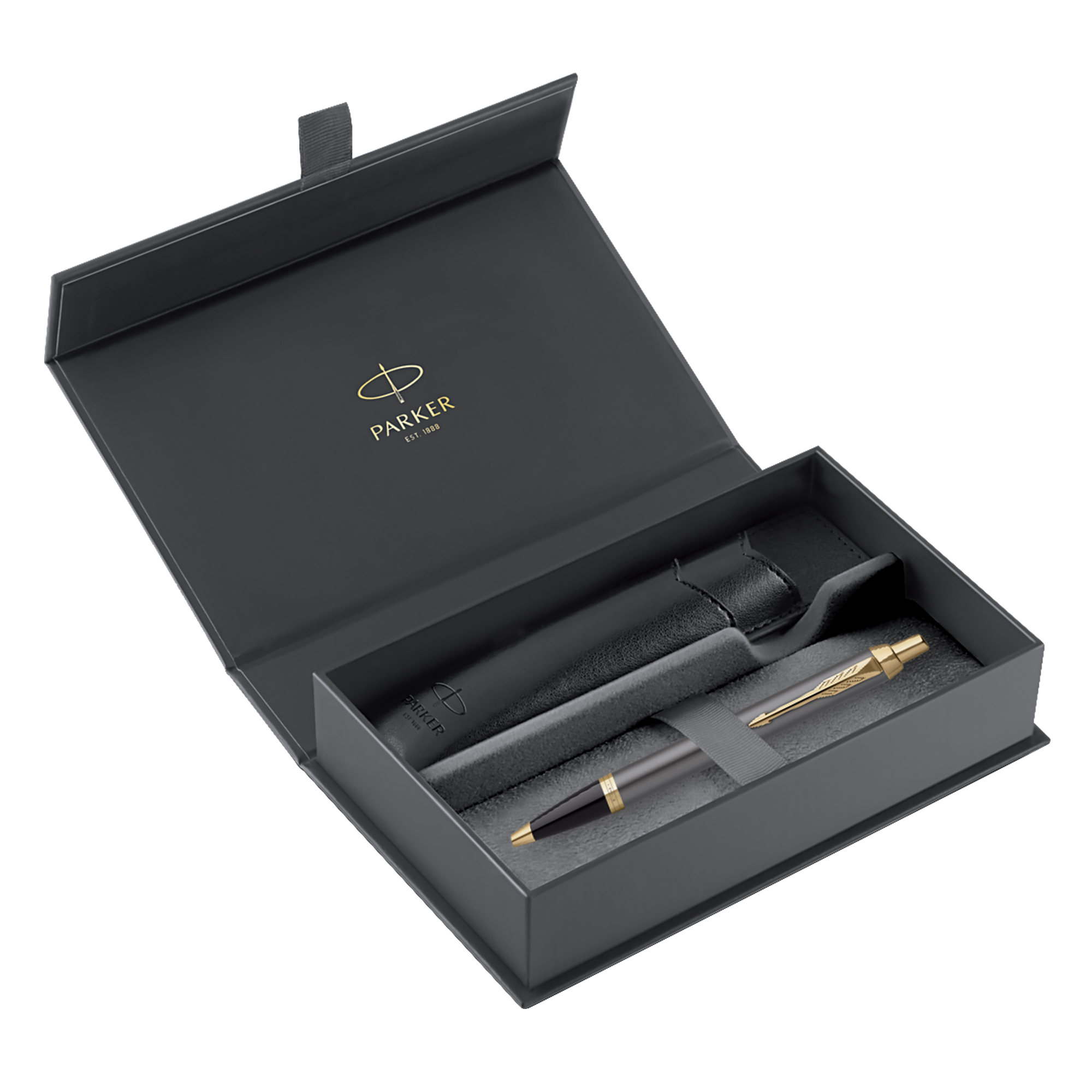 PARKER IM Prémium Black guľóčkové pero GT so zlatým klipom v darčekovej kazete s puzdrom na pero. Telo vyrobené z eloxovaného hliníka s ozdobnou rastrovanou rytinou v kombinácii s doplnkami pokovovanými zlatom s leštenou úpravou. Racionalita a nadčasová kvalita technologického spracovania Parker IM Premium predurčuje tento modelový rad pre život v pohybe. Nadbytočné detaily sú vynechané, prednosť je daná komfortu a účelnosti. Je to jeden z príkladov múdreho využitia silných stránok Parkeru – dokonalého spojenia tvaru a funkčnosti. Má stláčací mechanizmus. Pero je dodávané s modrou náplňou