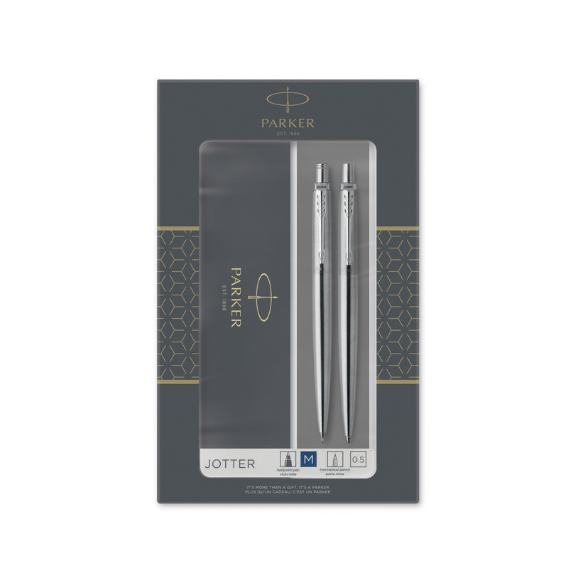 Súprava guľôčkového pera a mechanickej ceruzky Parker Jotter Stainless Steel CT Duo v darčekovom obale. Vyrobené z brúsenej nerez ocele v kombinácii s klipom pokovovaným chrómom s leštenou úpravou. Tuha v mechanickej ceruzke je HB 0,5mm. Parker JOTTER je veľmi obľúbený a dôverne známy dizajnérsky kúsok. Parker Jotter je oceňovaný predovšetkým pre svoju kvalitu, spoľahlivosť a priaznivý pomer ceny a výkonu. Parker Jotter je model, ktorý prostredníctvom žiarivých farieb a svojím praktickým, jednoduchým tvarom zosobňuje sociálnu stránku písania. Jotter je dokonalý Parker. Možnosť značenia - laserové gravírovanie