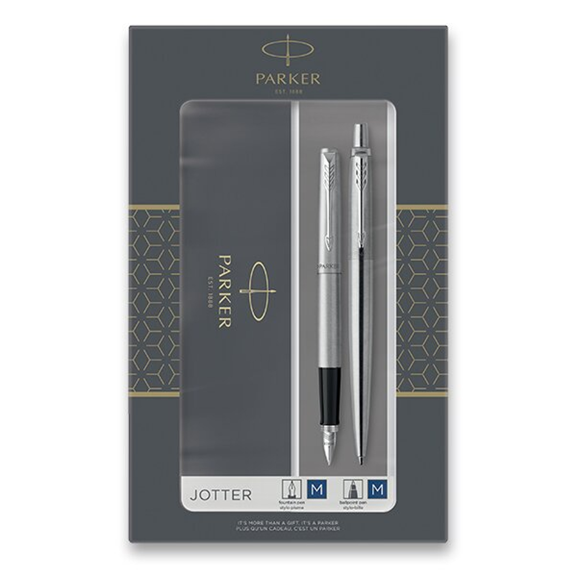 Súprava plniaceho pera a guľôčkového pera Parker Jotter Stainless Steel CT Duo v darčekovom obale. Telo a vrchnák je vyrobené z brúsenej nerez ocele v kombinácii s klipom pokovovaným chrómom s leštenou úpravou. Hrot atramentového pera je z nerez ocele zdobená jemnou rytinou. Farba bombičky je modrá. Parker JOTTER je veľmi obľúbený a dôverne známy dizajnérsky kúsok. Parker Jotter je oceňovaný predovšetkým pre svoju kvalitu, spoľahlivosť a priaznivý pomer ceny a výkonu. Parker Jotter je model, ktorý prostredníctvom žiarivých farieb a svojím praktickým, jednoduchým tvarom zosobňuje sociálnu stránku písania. Jotter je dokonalý Parker. Možnosť značenia - laserové gravírovanie