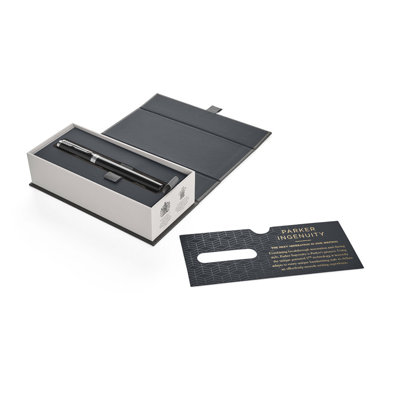 Z dielne PARKER vyšiel najnovší model INGENUITY ktorý je výsledkom špičkovej technológie. Moderný dizajn s prepracovaným charakteristickým klipom a robustné telo sú stvorené pre všetkých asertívnych jedincov, ktorý chcú byť vnímaný ako kultivovaný a úspešný. Parker Ingenuity je skvelý partner pre všetkých majstrov svojho odboru. Garantuje precízne dávkovanie náplne a príjemný zážitok z písania. Guľôčkové pero, zapínanie s otočným mechanizmom. Mosadzné telo pokryté čiernym lakom. Úchop a klip s ostatnými doplnky sú pokovované chrómom. Dodávané s čiernou náplňou