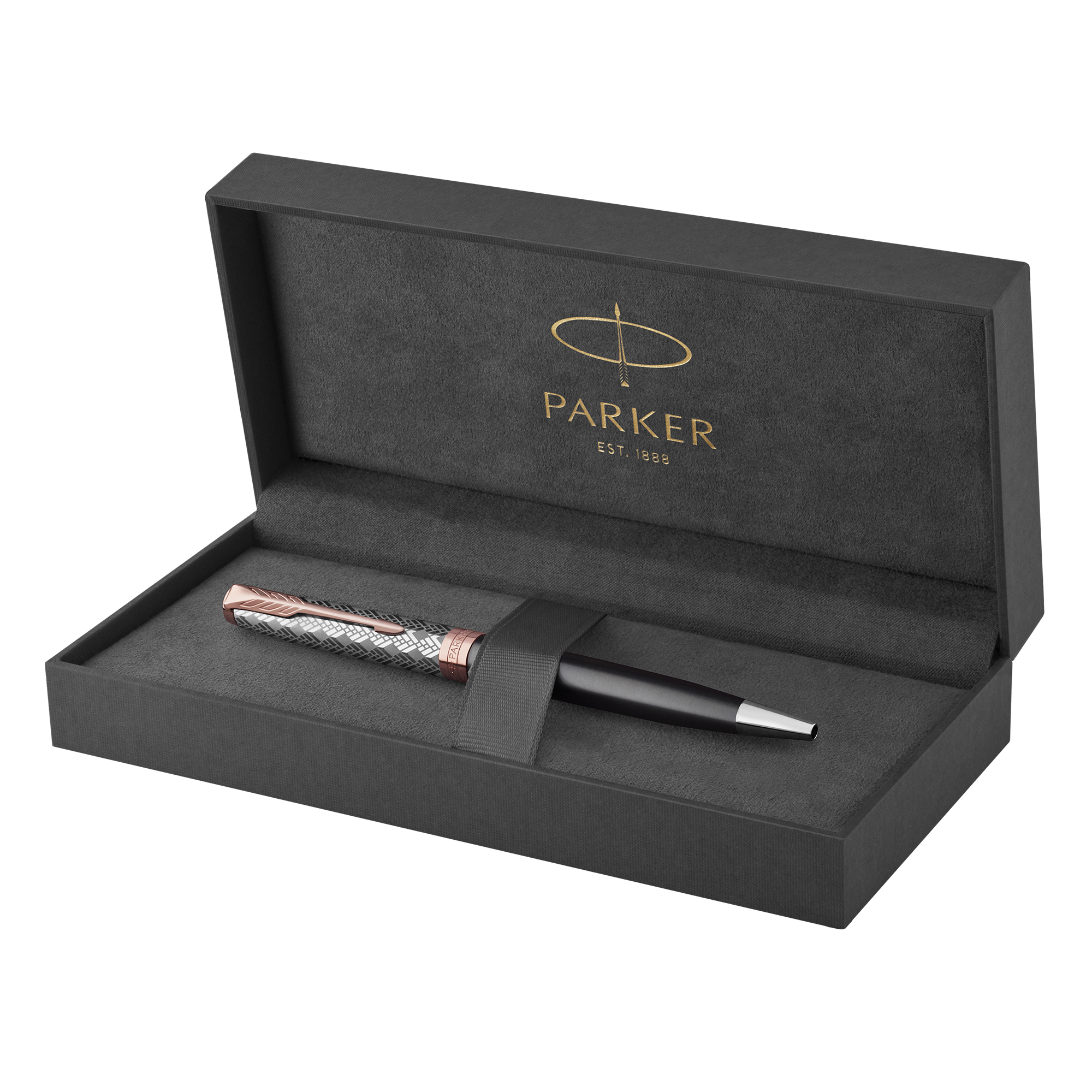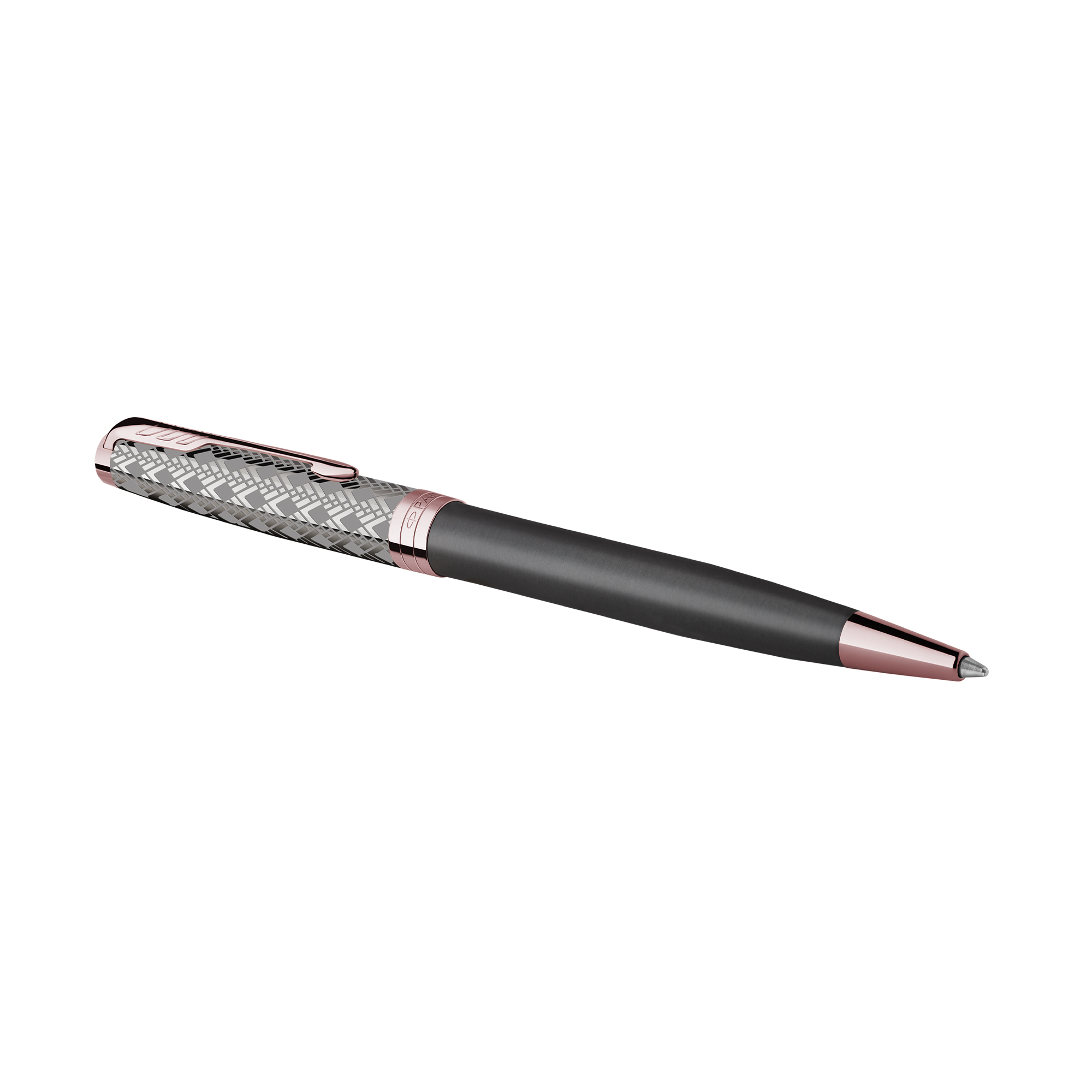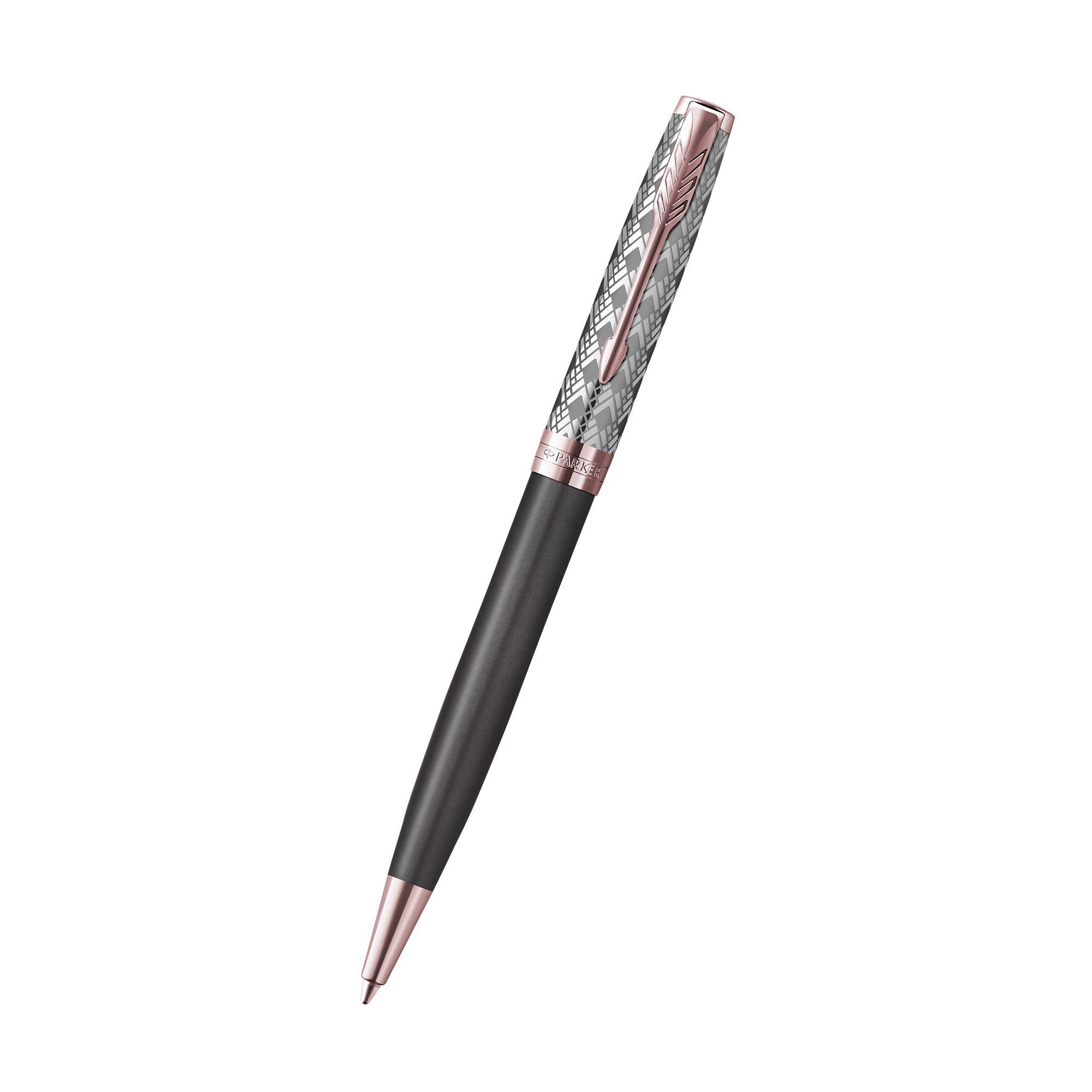 Guľôčkové pero Parker Sonnet Premium Metal Grey PGT má čierne lakované telo a vrchnú časť z leštenej nerezovej ocele so zdobeným vzorom vytvoreným pomocou leptania. Toto pero je v kombinácii s pozlátenými doplnkami s ružového zlata, ktoré dodávajú elegantný a sofistikovaný vzhľad. Mechanizmus zapínania je otočný, čo zabezpečuje pohodlné používanie. Pero je dodávané s čiernou náplňou a ponúka ideálnu rovnováhu medzi štýlom, funkčnosťou a kvalitou, typickú pre značku Parker. Modelová rada Sonnet Premium od Parkeru sa vyznačuje nadčasovou eleganciou a rôznymi povrchovými úpravami, ktoré zdôrazňujú tradíciu značky. Pero Sonnet je zosobnením všetkého, čo Parker robí najlepšie – od majstrovského spracovania hrotov až po dokonalé rozloženie hmotnosti pera, pričom každé pero je starostlivo zostavené z 17 rôznych dielov. Sonnet je skutočne nadčasová kolekcia, ktorá je vždy aktuálna a obľúbená.