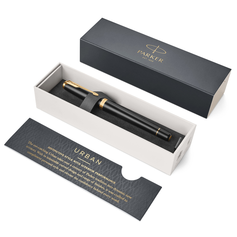 PARKER URBAN čierne matné plniace pero Urban je mladá, svieža generácia písacích potrieb v ktorej sa spája ergonomická nekonvenčnosť tvaru s dokonalým vyvážením a kvalitou. Je navrhnutý tak, aby robil dojem, vytvorený aby fungoval. Ak je kvalita súčasťou Vášho image, zvoľte si pre svoj moderný životný štýl Parker Urban. Doplnky sú pokovované zlatom.Hrot z ušlahtilej nerez ocele.