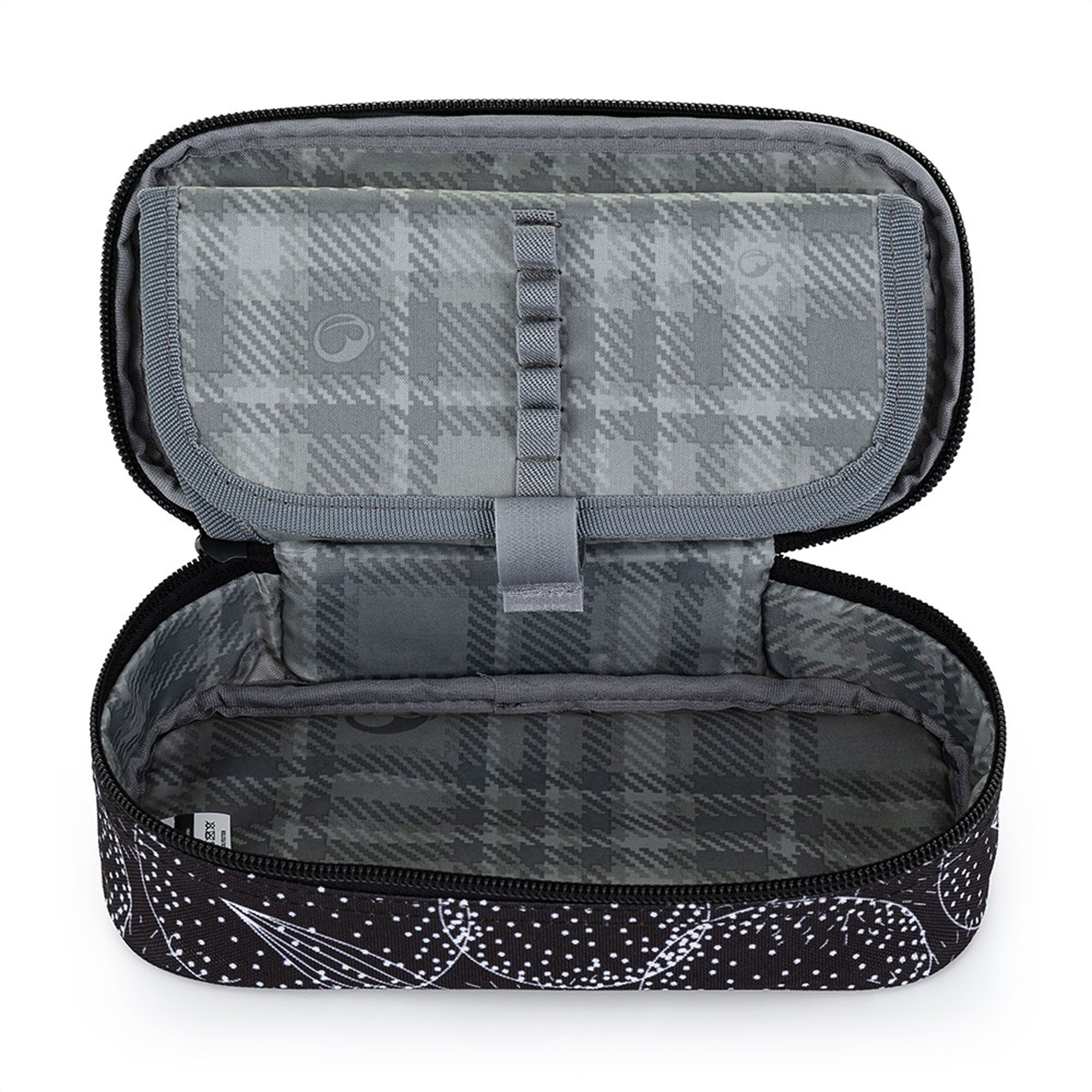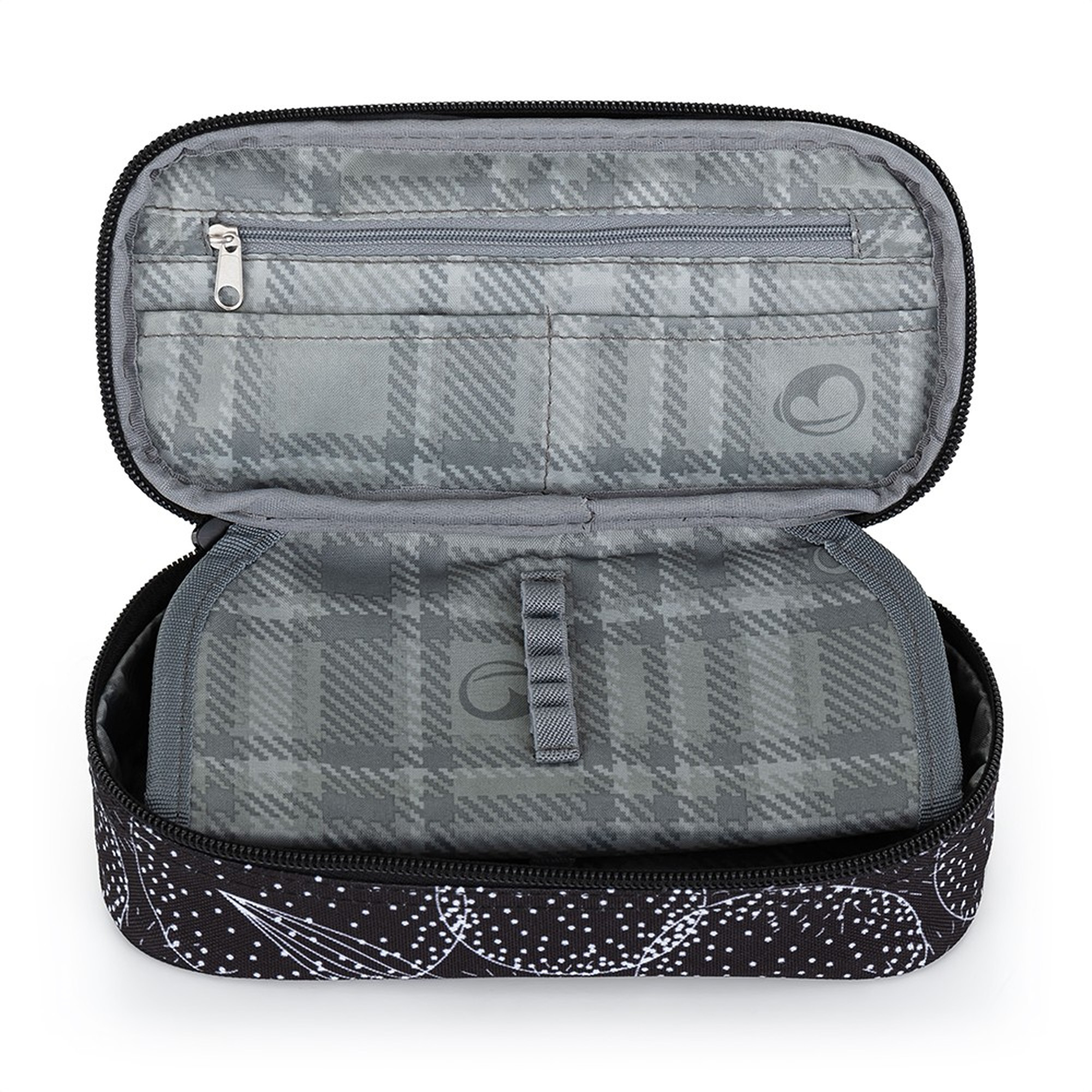 Jedno vnútorné vrecko na zips a dve menšie vrecká napr. na kartičky. 20 pružných úchytov na písacie potreby a ceruzky. Zapínanie na zips. Rozmery 21,5x11x6,5cm