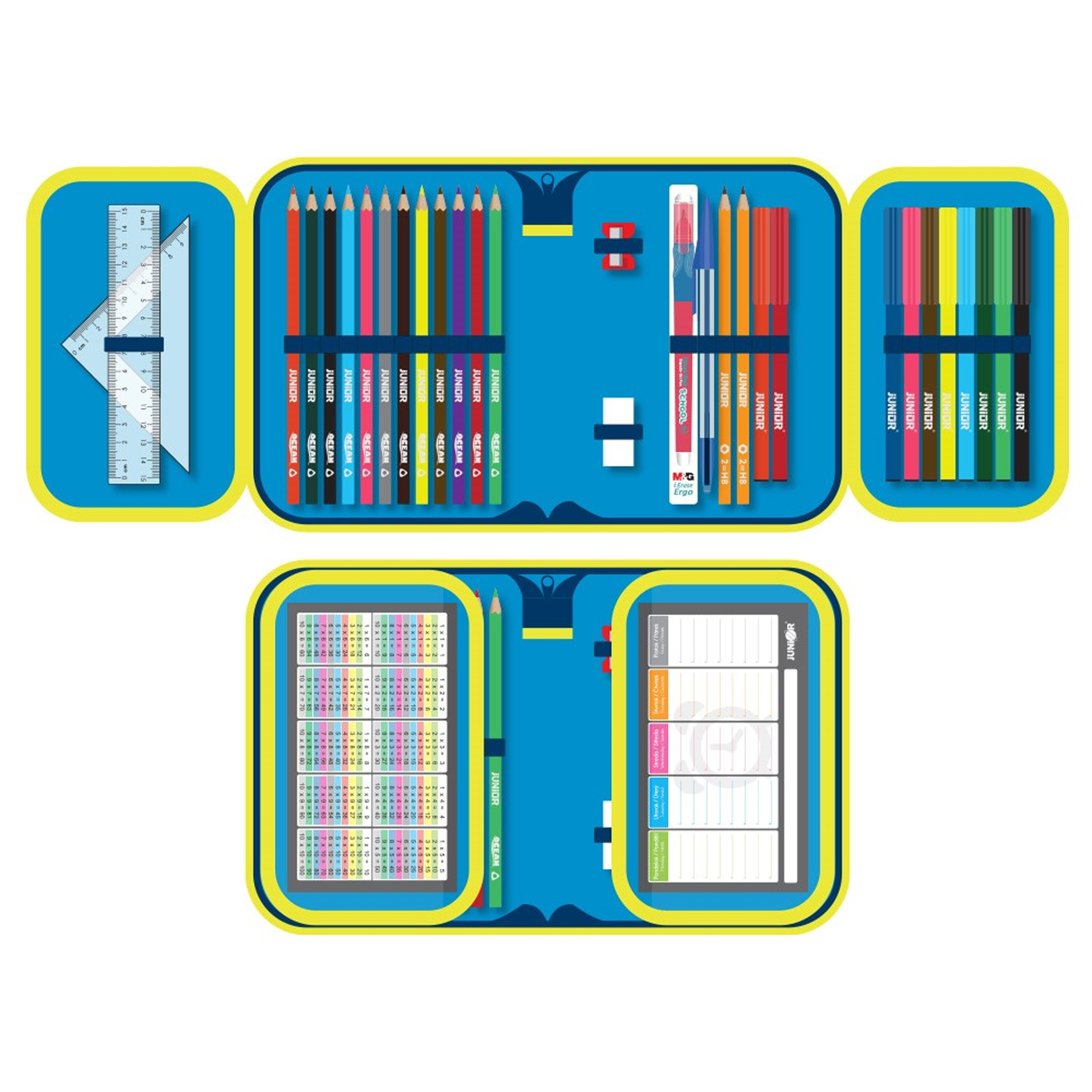 Peračník obsahuje: 1x rovné pravítko 15 cm, 1x pravítko trojuholník 10 cm , 1x strúhadlo, 1x syntetická guma, 1x rozvrh hodín a malá násobilka, 1x guľôčkové pero (modrá náplň), 2x grafitová ceruzka HB, trojuholníkové telo, 10x fixy s kónickou špičkou pre tenké čiary, 12x pastelky Ocean s trojuholníkovým telom. Rozmery: 200 x 145 x 45 mm