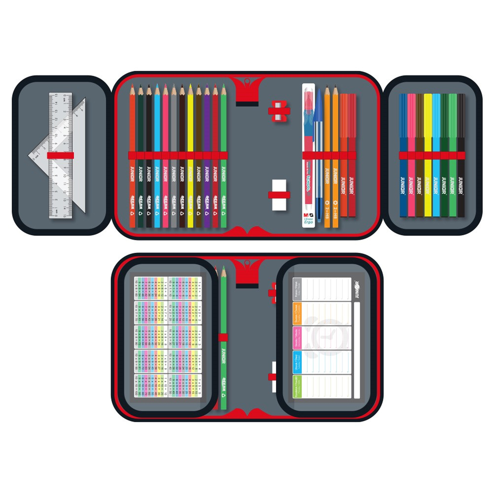 Peračník obsahuje: 1x rovné pravítko 15 cm, 1x pravítko trojuholník 10 cm , 1x strúhadlo, 1x syntetická guma, 1x rozvrh hodín a malá násobilka, 1x guľôčkové pero (modrá náplň), 2x grafitová ceruzka HB, trojuholníkové telo, 10x fixy s kónickou špičkou pre tenké čiary, 12x pastelky Ocean s trojuholníkovým telom. Rozmery: 200 x 145 x 45 mm