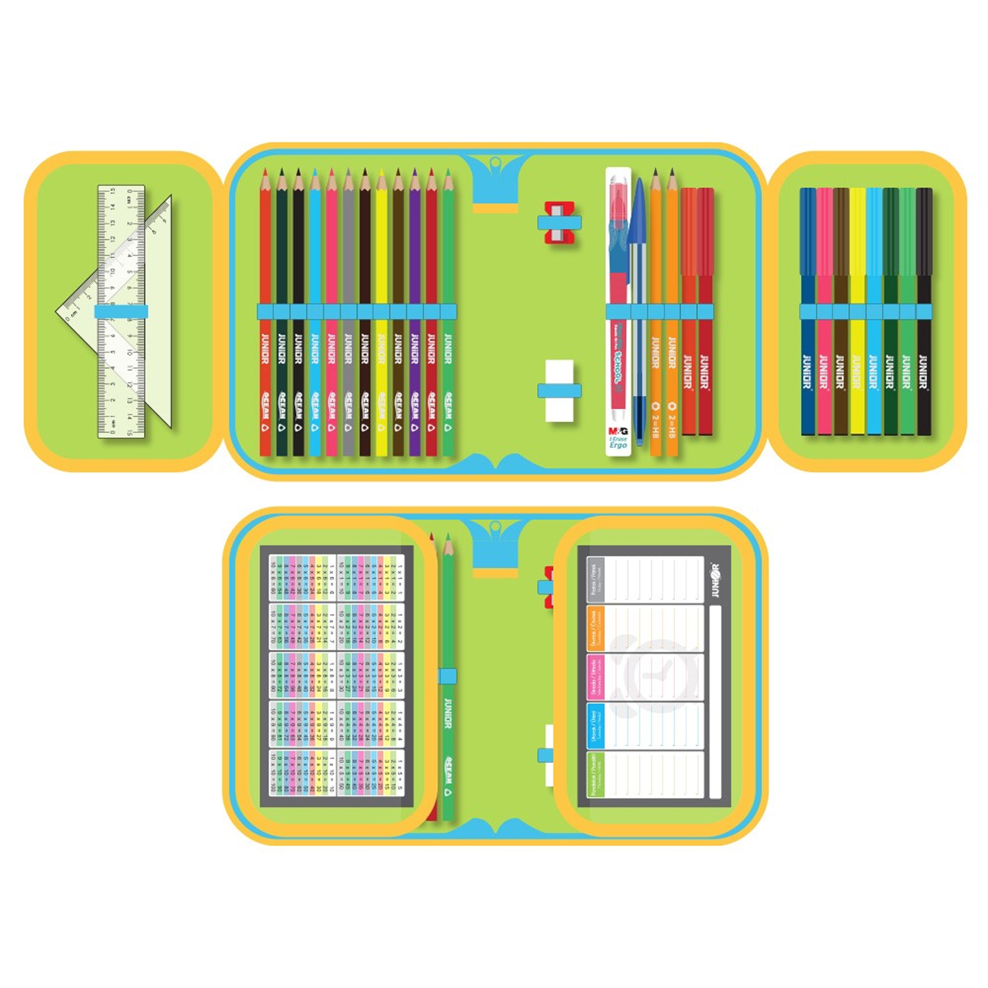 Peračník obsahuje: 1x rovné pravítko 15 cm, 1x pravítko trojuholník 10 cm , 1x strúhadlo, 1x syntetická guma, 1x rozvrh hodín a malá násobilka, 1x guľôčkové pero (modrá náplň), 2x grafitová ceruzka HB, trojuholníkové telo, 10x fixy s kónickou špičkou pre tenké čiary, 12x pastelky Ocean s trojuholníkovým telom. Rozmery: 200 x 145 x 45 mm
