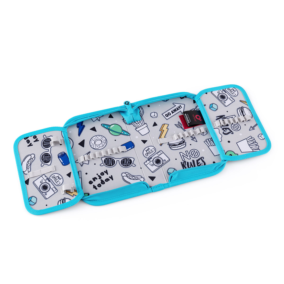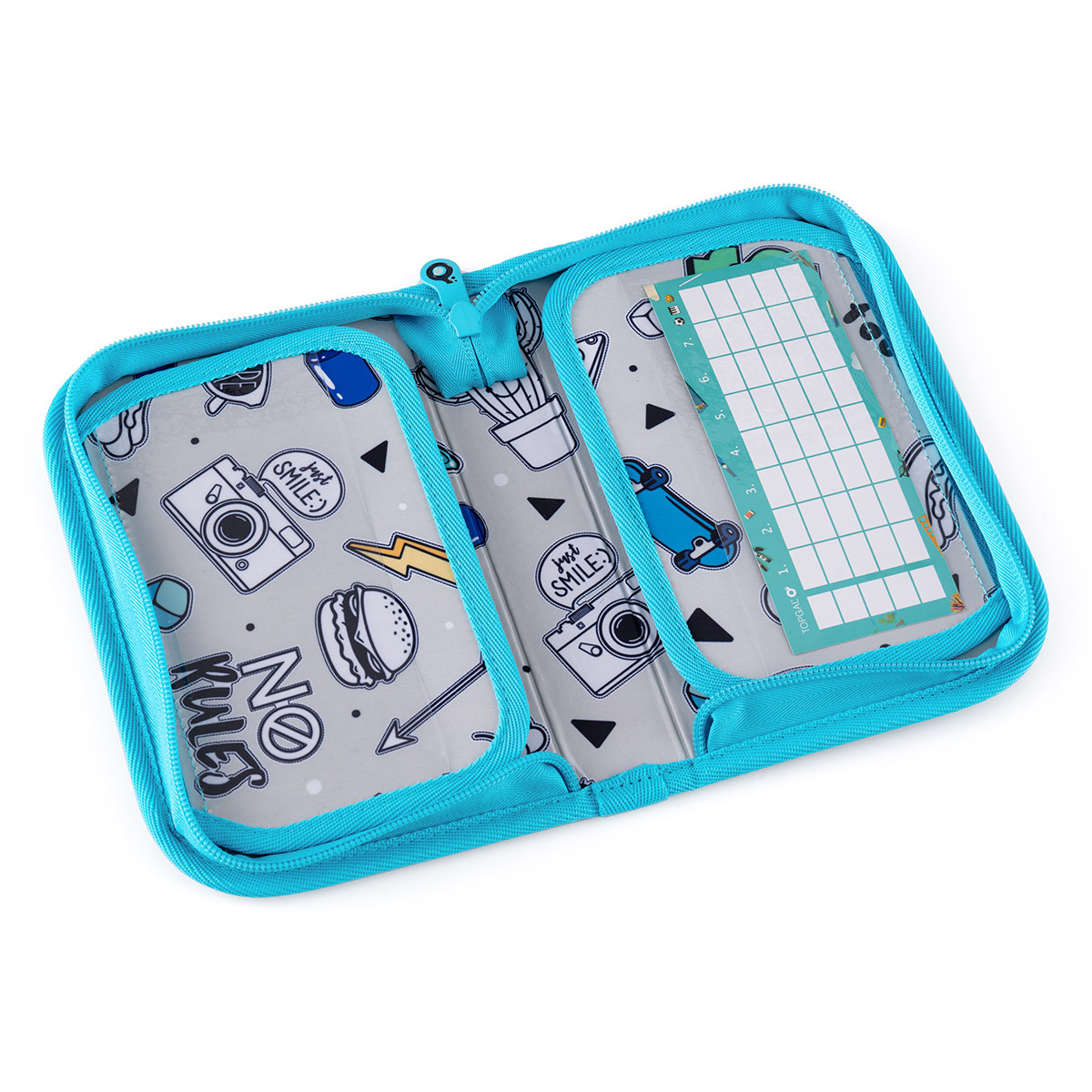 Jednokomorový školský peračník s dvoma chlopňami je vybavený 21 klasickými gumovými úchytmi na pastelky a fixky, troma širšími úchytmi na pravítka, kružidlo či nožnice, a dvoma väčšími úchytmi na gumu a strúhadlo. Pod chlopňou z priehľadnej fólie nájdete rozvrh hodín ale poslúži napríklad aj na ťaháky -)