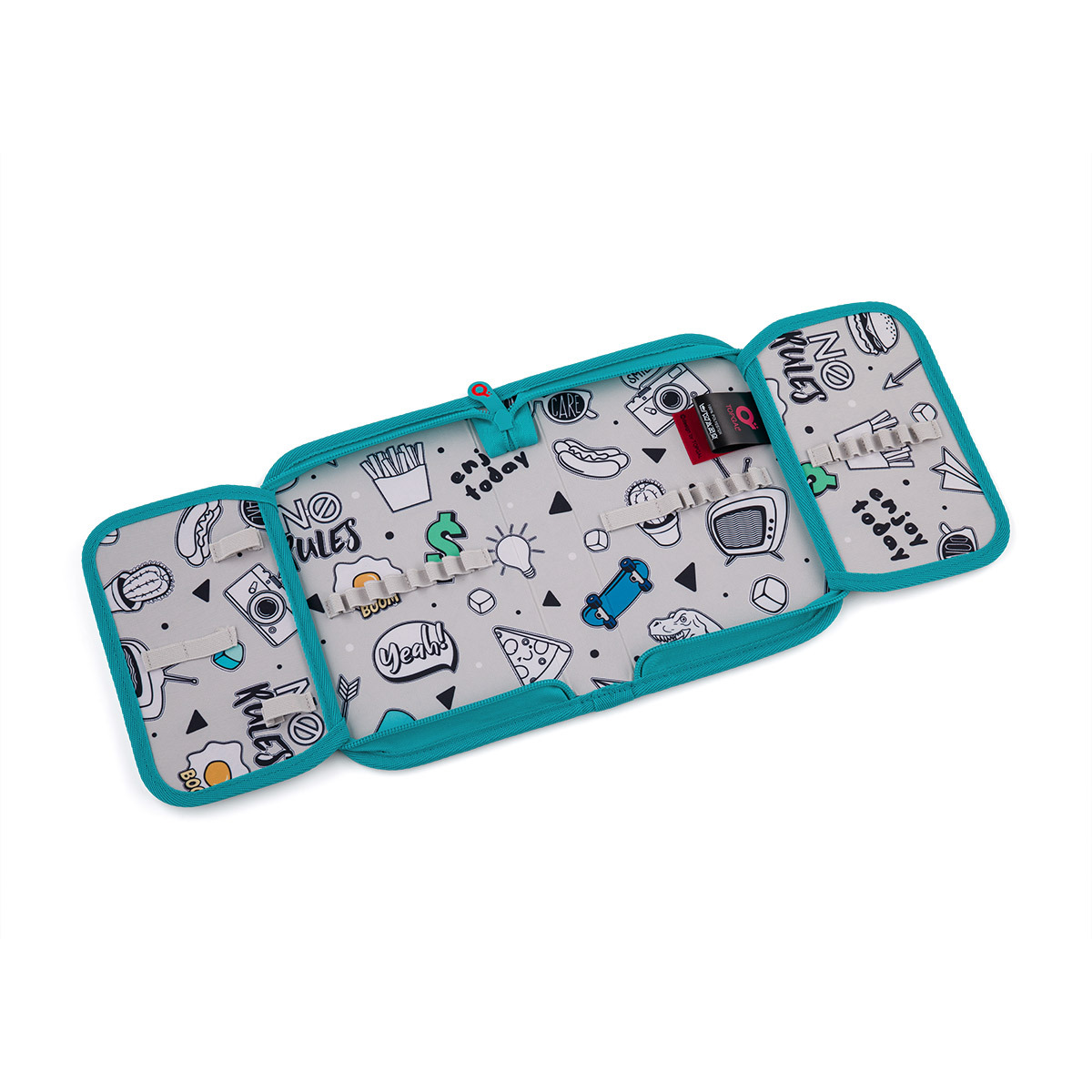Jednokomorový školský peračník s dvoma chlopňami je vybavený 21 klasickými gumovými úchytmi na pastelky a fixky, troma širšími úchytmi na pravítka, kružidlo či nožnice, a dvoma väčšími úchytmi na gumu a strúhadlo.