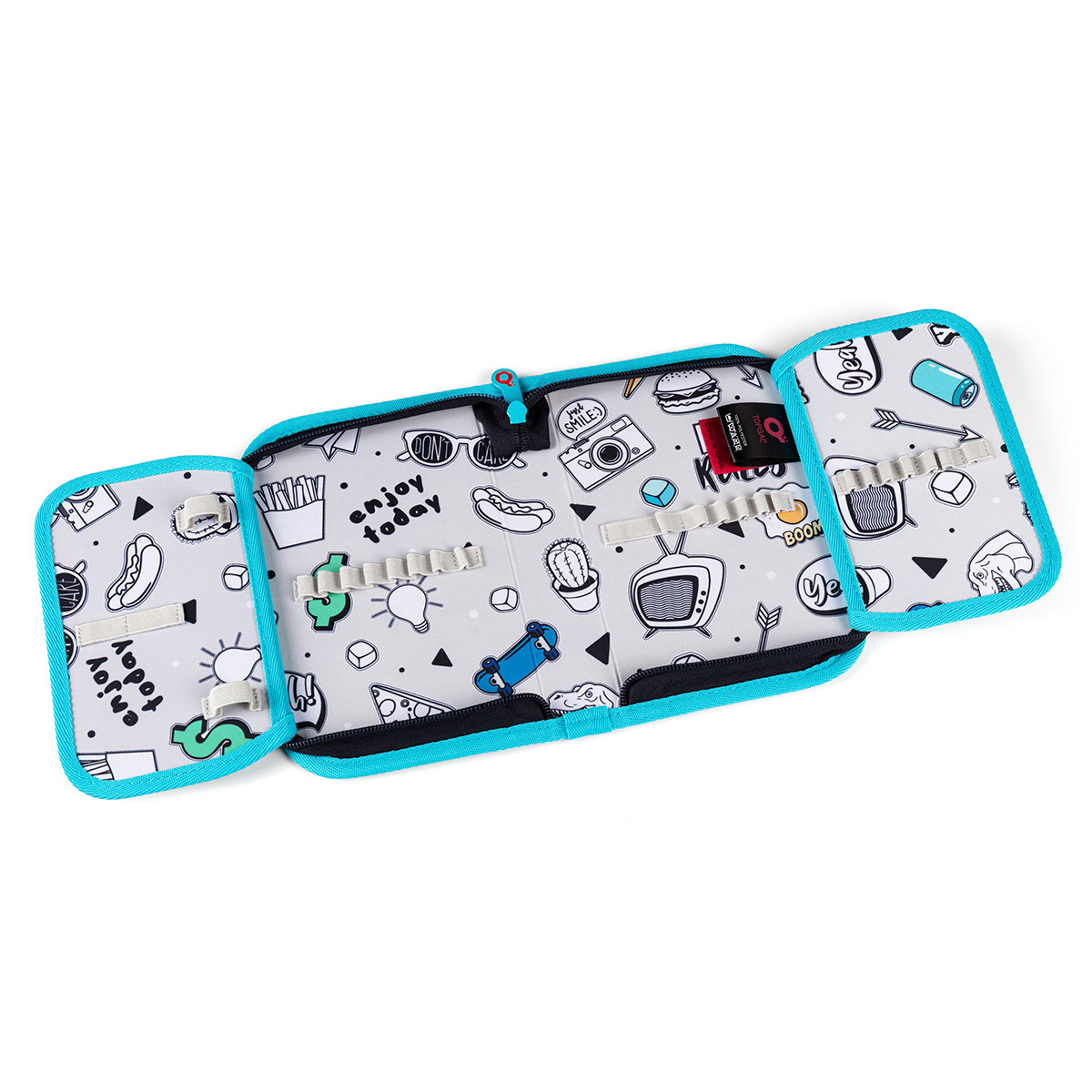 Jednokomorový školský peračník s dvoma chlopňami je vybavený 21 klasickými gumovými úchytmi na pastelky a fixky, troma širšími úchytmi na pravítka, kružidlo či nožnice, a dvoma väčšími úchytmi na gumu a strúhadlo.