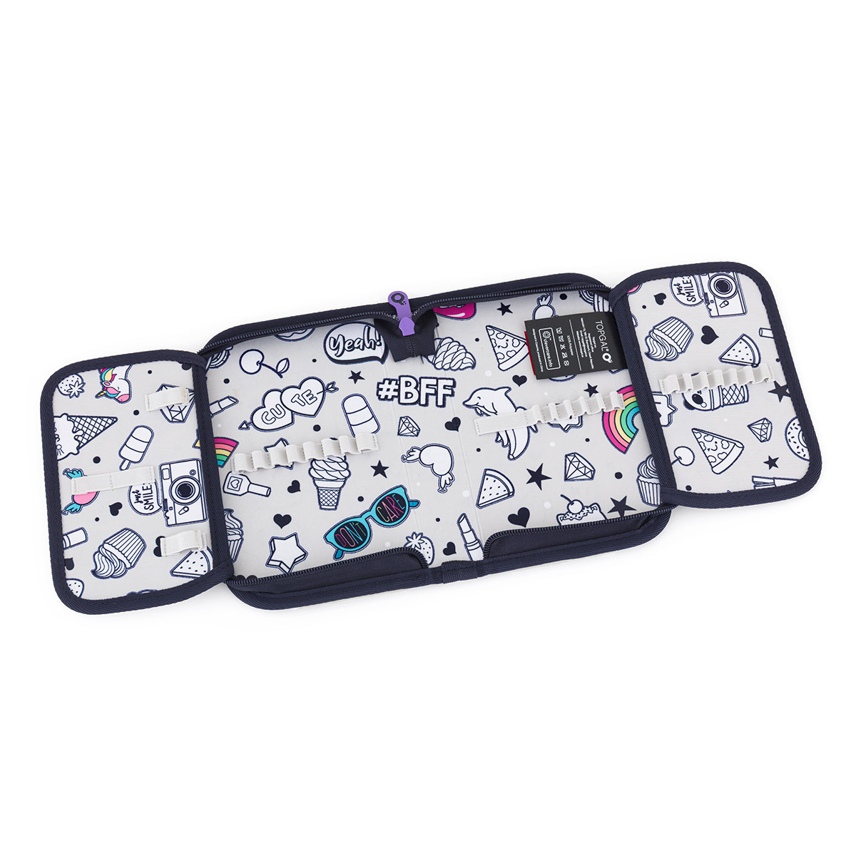 Jednopatrové školní pouzdro se dvěma klopami. Díky gumovým úchytům se do nich vejde celkem dvacetjedna pastelek, tužek a fixek. Tři širší úchyty poslouží na pravítko, kružítko či nůžky. Dva větší na gumu a ořezávátko.