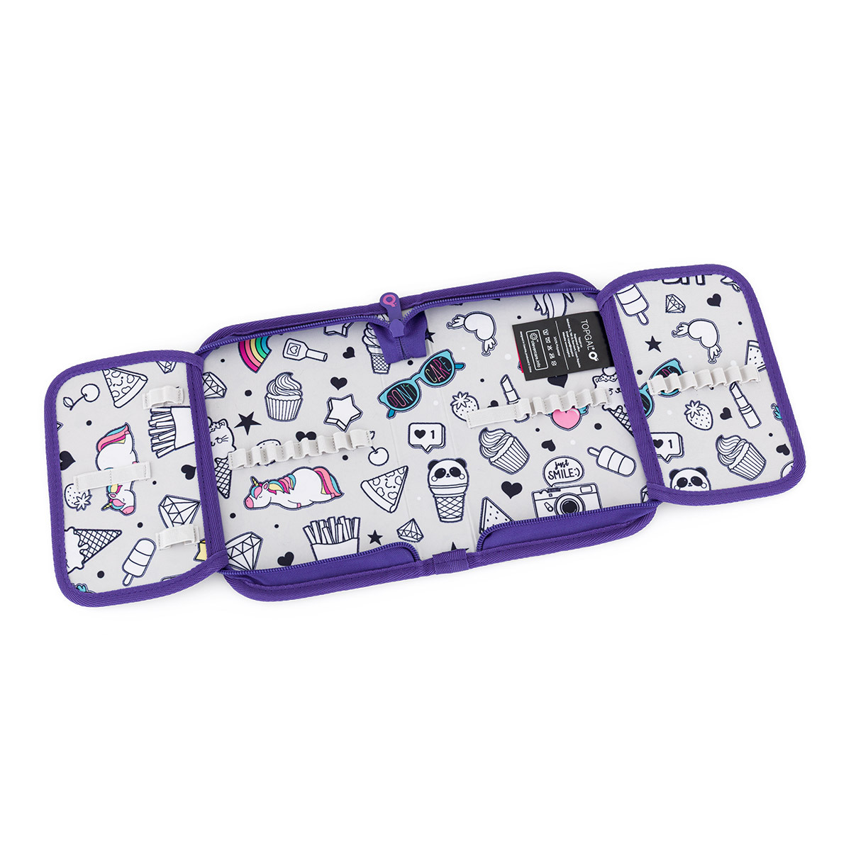 Jednopatrové školní pouzdro se dvěma klopami. Díky gumovým úchytům se do nich vejde celkem dvacetjedna pastelek, tužek a fixek. Tři širší úchyty poslouží na pravítko, kružítko či nůžky. Dva větší na gumu a ořezávátko.