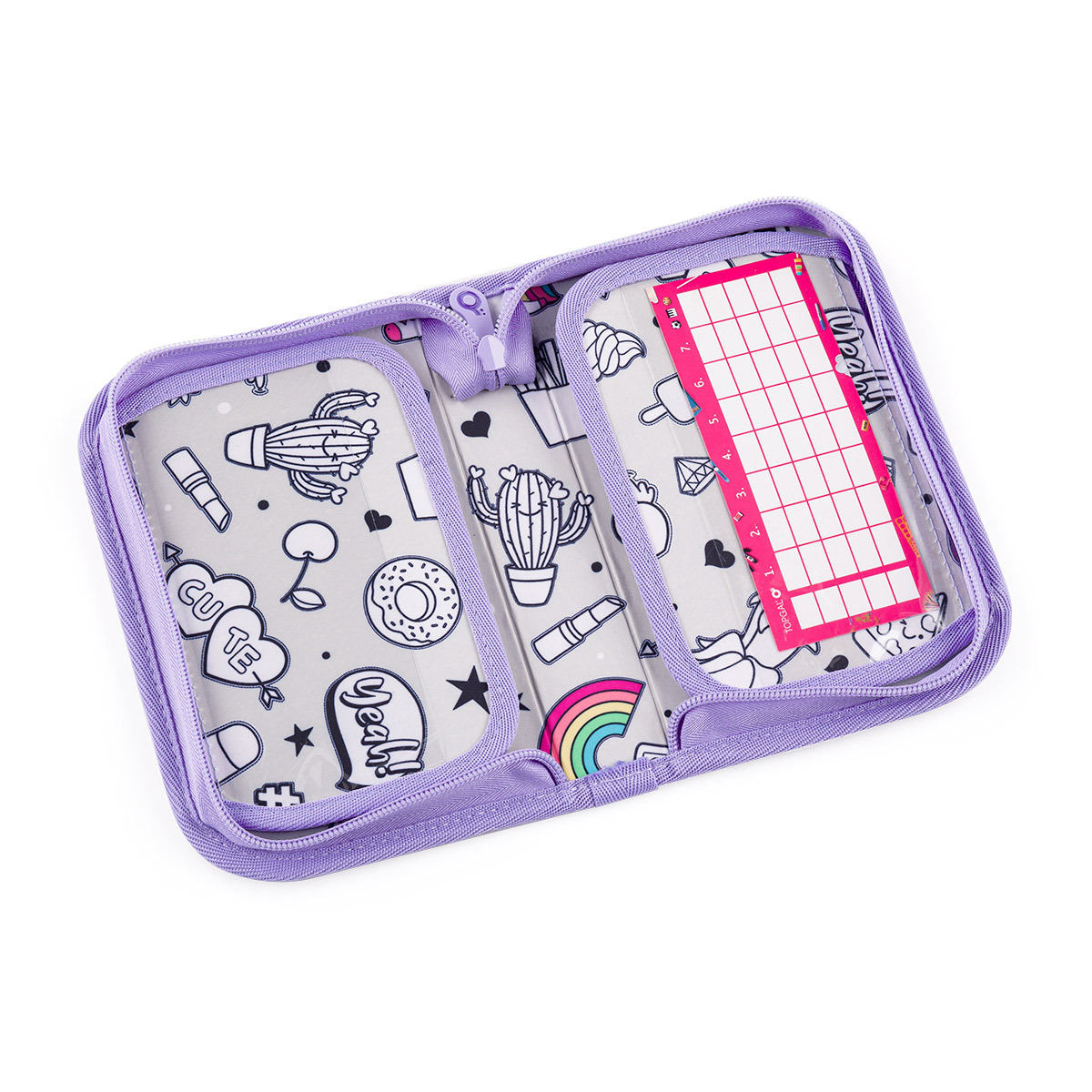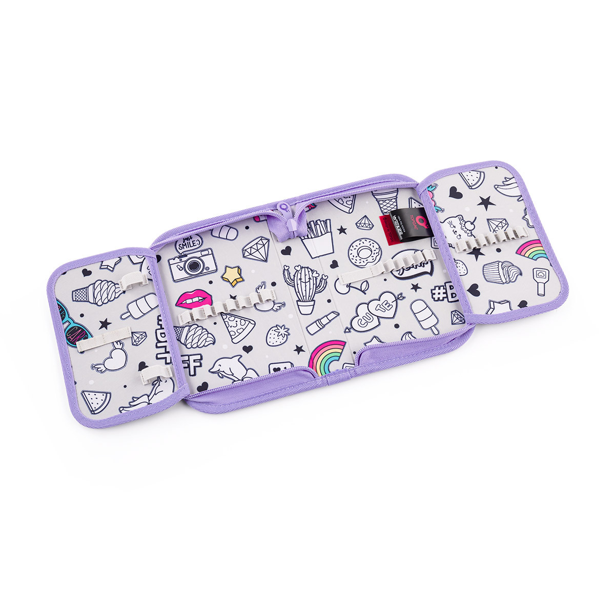 Jednokomorový školský peračník s dvoma chlopňami je vybavený 21 klasickými gumovými úchytmi na pastelky a fixky, troma širšími úchytmi na pravítka, kružidlo či nožnice, a dvoma väčšími úchytmi na gumu a strúhadlo. Pod chlopňou z priehľadnej fólie nájdete rozvrh hodín ale poslúži napríklad aj na ťaháky -)