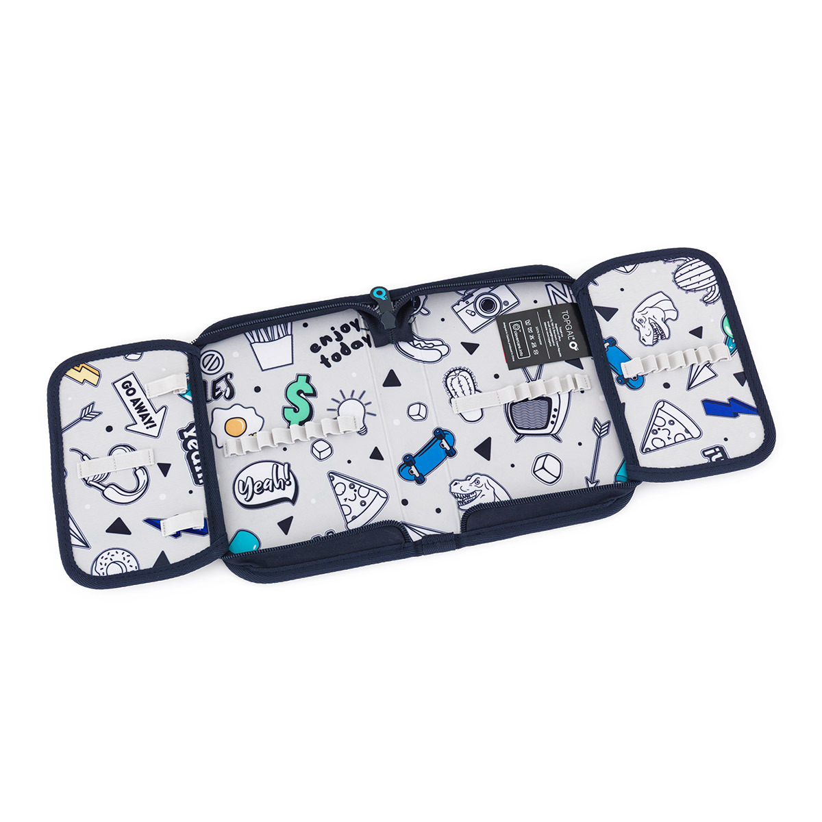 Jednopatrové školní pouzdro se dvěma klopami. Díky gumovým úchytům se do nich vejde celkem dvacetjedna pastelek, tužek a fixek. Tři širší úchyty poslouží na pravítko, kružítko či nůžky. Dva větší na gumu a ořezávátko.