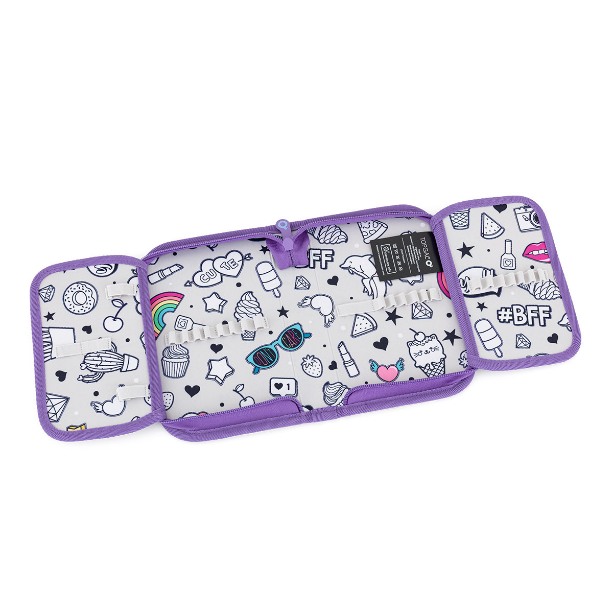 Jednopatrové školní pouzdro se dvěma klopami. Díky gumovým úchytům se do nich vejde celkem dvacetjedna pastelek, tužek a fixek. Tři širší úchyty poslouží na pravítko, kružítko či nůžky. Dva větší na gumu a ořezávátko.